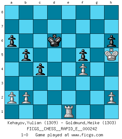 Last move : 1-0 2021 March 6 12:41:51 [Event "FICGS__CHESS__RAPID_E__000242"] [Site "FICGS"] [Date "2020.12.27"] [Round "1"] [White "Kehayov,Yulian"] [Black "Goldmund,Heike"] [Result "1-0"] [WhiteElo "1309"] [BlackElo "1303"] 1.d4 Nf6 2.Nf3 e6 3.c4 c5 4.d5 exd5 5.cxd5 d6 6.Nc3 b6 7.e4 Ba6 8.Bxa6 Nxa6 9.O-O Nc7 10.Bg5 Be7 11.e5 Nfxd5 12.Nxd5 Nxd5 13.Qxd5 Bxg5 14.Nxg5 Qxg5 15.Qxa8+ Qd8 16.Qxd8+ Kxd8 17.exd6 Kd7 18.Rad1 Re8 19.Rfe1 Rxe1+ 20.Rxe1 Kxd6 21.f4 f5 22.Kf2 a6 23.Kf3 h6 24.g4 g6 25.gxf5 gxf5 26.Kg3 b5 27.Kh4 c4 28.Kh5 1-0 Queen's pawn game Kingside Castling by player White (move 9) Player White won this chess game. Follow this game move after move (download)Some part of a mistake is always correct. (Savielly Tartakover) Schach ist Kampf, hauptsächlich jedoch gegen die eigenen Fehler. (Savielly Grigorievitsch Tartakower) Con el fin de mejorar tu juego, debes de estudiar los finales antes que todo, ya que mientras que los finales pueden ser estudiados y dominados por sí mismos, el juegomedio y la apertura deben de ser estudiados en relación con los finales. (José Raúl Capablanca) 'L'échange des dames est un coup dur pour les deux adversaires...' Un journaliste lors d'une partie du match Spassky-Fischer Depression is just anger without enthusiasm. (Unknown)