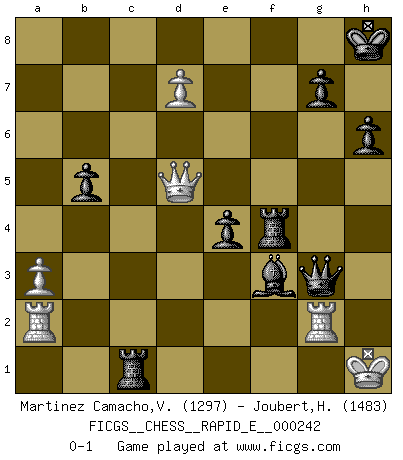 Last move : 0-1 2021 March 16 14:47:19 [Event "FICGS__CHESS__RAPID_E__000242"] [Site "FICGS"] [Date "2020.12.27"] [Round "1"] [White "Martinez Camacho,Victor Hugo"] [Black "Joubert,Hennie"] [Result "0-1"] [WhiteElo "1297"] [BlackElo "1483"] 1.e4 c5 2.Nc3 Nc6 3.g3 e6 4.Bg2 d6 5.Nge2 Nf6 6.O-O a6 7.d3 Be7 8.h3 O-O 9.Be3 Bd7 10.Qd2 Rc8 11.Kh2 b5 12.a3 Qc7 13.f4 e5 14.Nd5 Nxd5 15.exd5 Nd8 16.c4 f5 17.fxe5 dxe5 18.b4 Nf7 19.cxb5 axb5 20.bxc5 Bxc5 21.Bxc5 Qxc5 22.Rfc1 Qf2 23.Rf1 Qb6 24.Rfc1 h6 25.Nc3 Nd6 26.Ne2 e4 27.dxe4 Nxe4 28.Bxe4 fxe4 29.d6 Qf2+ 30.Kh1 Bxh3 31.Rg1 Bg4 32.Qd5+ Kh8 33.Nf4 Rxf4 34.Ra2 Bf3+ 35.Rg2 Qxg3 36.d7 Rc1+ 0-1 Sicilian : Closed Kingside Castling by player White (move 6) Kingside Castling by player Black (move 8) Player Black won this chess game. Follow this game move after move (download)I thought the most common mistake [in chess] was the first one: Learning the game :P (Garvin Gray, FICGS forum) Ein typischer, sehr verbreiteter Gedankenschädling ist der, daß der betreffende Amateur von der Annanhme ausgeht, daß jeder einzelne Zug etwas zu leisten habe. (Aaron Nimzowitsch) Desconfianza es la característica mas necesaria de un jugador de Ajedrez. (Siegbert Tarrasch) Aucun coup ne doit être joué sans but. (Pedro Damiano) When it is a question of money, everybody is of the same religion. (Voltaire)