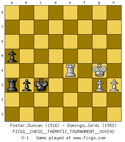 Last move : 0-1 2021 June 14 18:3:5 [Event "FICGS__CHESS__THEMATIC_TOURNAMENT__000242"] [Site "FICGS"] [Date "2020.12.28"] [Round "1"] [White "Foster,Duncan"] [Black "Domingo,Jordi"] [Result "0-1"] [WhiteElo "1916"] [BlackElo "1952"] 1.e4 e5 2.Bc4 f5 3.d3 Nc6 4.a3 Nf6 5.Nc3 fxe4 6.dxe4 Bc5 7.Nf3 d6 8.O-O Bg4 9.h3 Bh5 10.Qd3 Qd7 11.Ng5 Nd4 12.Be3 h6 13.Bxd4 exd4 14.e5 dxe5 15.Nce4 Nxe4 16.Nxe4 Bd6 17.Nxd6+ Qxd6 18.Qe4 Bf7 19.Bxf7+ Kxf7 20.f4 Rhe8 21.fxe5 Kg8 22.Rae1 Qb6 23.Qd5+ Re6 24.Kh1 c5 25.b4 Qc6 26.Qxc6 Rxc6 27.bxc5 Rxc5 28.Rf4 Rc4 29.e6 Re8 30.e7 g5 31.Rf6 Kg7 32.Rfe6 Rxc2 33.Rd6 Rc7 34.Rxd4 Rcxe7 35.Rxe7+ Rxe7 36.Kh2 Kf6 37.a4 b6 38.Kg3 Kf5 39.Kf3 Ke5 40.Rd2 Re6 41.Rd7 a5 42.g3 Rc6 43.Rb7 Kd5 44.Re7 Rc4 45.Rh7 Rxa4 46.Rxh6 b5 47.Rh5 b4 48.Rxg5+ Kc4 49.Rg4+ Kc3 50.Re4 Ra3 51.Kg4 b3 0-1 Bishop's Opening : Calabrese counter-gambit, Jaenisch variation Kingside Castling by player White (move 8) 10 pieces endgame at move 45 : White KRPP , Black KRPPPP WHITE : King + 1 Rook 2 Pawns BLACK : King + 1 Rook 4 Pawns 9 pieces endgame at move 46 : White KRPP , Black KRPPP WHITE : King + 1 Rook 2 Pawns BLACK : King + 1 Rook 3 Pawns 8 pieces endgame at move 48 : White KRPP , Black KRPP WHITE : King + 1 Rook 2 Pawns BLACK : King + 1 Rook 2 Pawns Player Black won this chess game. Follow this game move after move (download)Many Chess players were surprised when after the game, Fischer quietly explained: 'I had already analyzed this possibility' in a position which I thought was not possible to foresee from the opening. (Mikhail Tal) Rubinstein ist ein Turmendspiel, welches die Götter vor tausenden von Jahren begannen. (Savielly Grigorievitsch Tartakower) El Ajedrez es el juego mas altamente simbólico, pero las agresiones estan por lo tanto aún mas francamente representadas en la partida. Tal vez comenzo como un juego de guerra; Algo como la representación de una batalla en miniatura entre las fuerzas de dos reinos. (Karl Meninger) A ce moment-là, je menaçais de comprendre la position ! (Clément L'Heureux) Whatever you do, don't be bored. This is absolutely the most exciting time we could have possibly hoped to be alive. And things are just starting. (From movie Waking life)