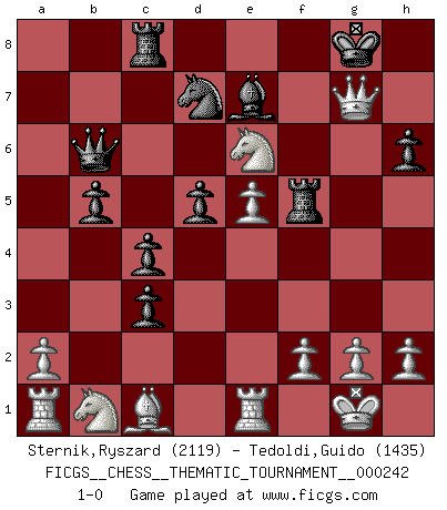 Last move : 1-0 2021 January 31 15:46:13 [Event "FICGS__CHESS__THEMATIC_TOURNAMENT__000242"] [Site "FICGS"] [Date "2020.12.28"] [Round "1"] [White "Sternik,Ryszard"] [Black "Tedoldi,Guido"] [Result "1-0"] [WhiteElo "2119"] [BlackElo "1435"] 1.e4 e5 2.Bc4 c5 3.Nf3 d6 4.c3 Nf6 5.d4 h6 6.dxe5 Nxe4 7.Qd5 Be6 8.Bb5+ Nd7 9.Qxe4 d5 10.Qe3 Be7 11.Bd3 O-O 12.O-O Rc8 13.Na3 a6 14.Bc2 f6 15.Re1 f5 16.Nb1 b5 17.Qe2 c4 18.b4 a5 19.Nd4 Qb6 20.Qh5 axb4 21.Qg6 bxc3 22.Nxe6 Rf7 23.Bxf5 Rxf5 24.Qxg7+ 1-0 Bishop's Opening Kingside Castling by player Black (move 11) Kingside Castling by player White (move 12) Player White won this chess game. Follow this game move after move (download)The passed pawn is a criminal, who should be kept under lock and key. Mild measures, such as police surveillance, are not sufficient. (Nimzovitch) Ich glaube, ich kenne inzwischen die Gründe für mein Versagen: schachliche Charakterfehler. Ich war nie ein Wunderkind und in meiner gesamten menschlichen Entwicklung immer zu langsam. (Viktor Kortschnoi) Si el ingenio solamente fuese necesario para lucirse, las mujeres serían las mejores jugadoras de Ajedrez del mundo. (Albin) Karpov est une pièce de musée. (Garry Kasparov) For a mechanic, you seem to do an excessive amount of thinking. (C-3PO in Star Wars ep.2)