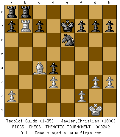 Last move : 0-1 2021 February 4 7:20:0 [Event "FICGS__CHESS__THEMATIC_TOURNAMENT__000242"] [Site "FICGS"] [Date "2020.12.28"] [Round "1"] [White "Tedoldi,Guido"] [Black "Javier,Christian"] [Result "0-1"] [WhiteElo "1435"] [BlackElo "1800"] 1.e4 e5 2.Bc4 Nf6 3.Nf3 Nxe4 4.Qe2 d5 5.Bb3 Nc6 6.O-O Bg4 7.d3 Nc5 8.h3 Bxf3 9.Qxf3 Nd4 10.Qxd5 Qxd5 11.Bxd5 Nxc2 12.Na3 Nxa1 13.Bc4 Ne6 14.Be3 Bxa3 15.Rxa1 Bxb2 16.Rb1 Bd4 17.Rxb7 Ke7 18.Bxd4 exd4 19.g3 Rhb8 0-1 Bishop's Opening : Berlin defense Kingside Castling by player White (move 6) Player Black won this chess game. Follow this game move after move (download)A passed Pawn increases in strength as the number of pieces on the board diminishes. (Capablanca) Ich bin stolz ein Bulgare zu sein. (Veselin Topalov) Vive, pierde y aprende al observar a tu oponente como gana. (Amber Steenbock) L'action d'une oeuvre littéraire se déroule sur un champ de bataille. Les masques et les types du drame moderne correspondent aux pièces du jeu d'échecs. L'intrigue correspond aux coups et aux gambits, c'est à dire aux techniques du jeu telles qu'utilisées et interprétées par les joueurs. Les tactiques et les péripéties [mouvements] correspondent aux coups exécutés par l'adversaire. (Viktor Shklovsky) A proverb is a short sentence based on long experience. (Miguel de Cervantes)