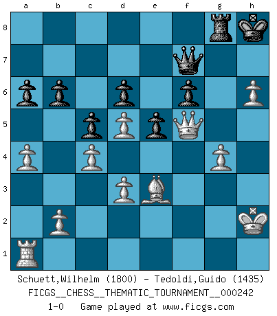 Last move : 1-0 2021 March 6 0:26:38 [Event "FICGS__CHESS__THEMATIC_TOURNAMENT__000242"] [Site "FICGS"] [Date "2020.12.28"] [Round "1"] [White "Schuett,Wilhelm"] [Black "Tedoldi,Guido"] [Result "1-0"] [WhiteElo "1800"] [BlackElo "1435"] 1.e4 e5 2.Bc4 c5 3.d3 Nf6 4.Nc3 Be7 5.f4 Nc6 6.Nf3 d6 7.O-O h6 8.h3 O-O 9.f5 a6 10.a4 b6 11.g4 Nh7 12.Kg2 Bb7 13.Nd5 Bg5 14.Rh1 Ne7 15.Nxg5 Nxd5 16.Nxh7 Kxh7 17.Bxd5 Bxd5 18.exd5 Rc8 19.g5 Qd7 20.Qg4 Qb7 21.c4 Rg8 22.Kh2 g6 23.gxh6 f6 24.fxg6+ Rxg6 25.Qf5 Rcg8 26.Rg1 Qf7 27.Be3 Kh8 28.Rg4 Rxg4 29.hxg4 1-0 Bishop's Opening Kingside Castling by player White (move 7) Kingside Castling by player Black (move 8) Player White won this chess game. Follow this game move after move (download)Mistrust is the most necessary characteristic of the Chess player. (Siegbert Tarrasch) Kasparov stellt für gewöhnlich die Regeln auf und bricht sie dann selbst wieder. (Alexej Shirov) Hay jugadores fuertes y personas amables y yo soy un jugador fuerte. (Bobby Fischer) Le jeu d'échecs est comme rejeté hors du temps. (Antoine de Saint-Exupéry) Plans are ideas that never come to fruition. (Daniel Parmet)