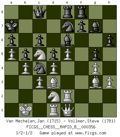 Last move : 1/2-1/2 2021 February 19 14:54:0 [Event "FICGS__CHESS__RAPID_B__000356"] [Site "FICGS"] [Date "2020.12.30"] [Round "1"] [White "Van Mechelen,Jan"] [Black "Vollmer,Steve"] [Result "1/2-1/2"] [WhiteElo "1715"] [BlackElo "1781"] 1.e4 e5 2.f4 exf4 3.Nf3 Be7 4.Nc3 Bh4+ 5.Ke2 c6 6.d3 d5 7.Bxf4 Be7 8.Kd2 Nf6 9.e5 Ng4 10.Qe1 Qb6 11.h3 Qb4 12.d4 Nh6 13.a3 Qa5 14.Bd3 Be6 15.Qg3 Bf8 16.b4 Qc7 17.Rhe1 Nd7 18.Ne2 Nb6 19.c3 O-O-O 20.Nc1 Nc4+ 21.Kc2 Nf5 22.Qf2 h6 23.g4 Ne7 24.Nb3 b6 25.Bg3 Kb7 26.a4 g5 27.a5 Bg7 28.Ra2 Qd7 29.Rea1 Ra8 30.Qe1 Rhe8 31.Qb1 Qc7 32.Ra4 b5 33.Nc5+ Kc8 34.R4a2 a6 35.Qe1 Kb8 36.Rd1 Ka7 37.Kb1 Rf8 38.Re2 Rae8 39.Nd2 Qc8 1/2-1/2 KGA : Cunningham defense Queenside Castling by player Black (move 19) This chess game ended in a draw. Follow this game move after move (download)I won't play with you anymore. You have insulted my friend. - When an opponent cursed himself for a blunder. (Miguel Najdorf) Ja, ich habe einmal eine Blitzpartie gespielt, es war in einem Zug, 1929. --im Interview 1989 (Mikhail Moiseyevich Botvinik) Yo no creo en la psicología. Yo creo en las buenas movidas. (Bobby Fischer) Vous m'avez demandé de vous exposer quel est le fondement de la prière. Je ne fais que préparer les pièces du jeu sur la table... Nous sera-t-il permis d'en adopter les règles et si nous les appliquons scrupuleusement nous ne tarderons pas à faire mat le Roi divin ! Il ne pourra échapper à nos mains. (Sainte Thérèse d'Avila, Chemin de perfection) Success without honor is an unseasoned dish; it will satisfy your hunger, but it won't taste good. (Joe Paterno)