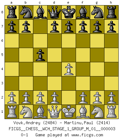 Last move : 0-1 2007 August 12 3:19:15 [Event "FICGS__CHESS__WCH_STAGE_1_GROUP_M_01__000003"] [Site "FICGS"] [Date "2007.07.11"] [Round "1"] [White "Vovk,Andrey"] [Black "Martinu,Paul"] [Result "0-1"] [WhiteElo "2484"] [BlackElo "2414"] 1.e4 c5 0-1 This chess game has been lost on time (started : 2007.07.11 17:27:14) Sicilian defense Player Black won this chess game. Follow this game move after move (download)Fischer is under obligation to nobody. (Joseph Platz) Woher wissen wir, daß der Neanderthaler Blindschach gespielt hat? -- Bei Ausgrabungen wurden keine Schachbretter und Figuren gefunden. (Anonymous) Botvinnik trataba de restarle el misterio al Ajedrez, siempre relacionandolo a situaciones de la vida ordinaria. El gustaba de llamar al Ajedrez un típico problema inexacto similar a aquellos de los cuales la gente siempre tiene que enfrentarse en la vida cotidiana. (Garry Kasparov) Si je n'étais pas joueur d'échecs, je serais le meilleur dans quelque chose d'autre. (Anatoli Karpov) To send light into the darkness of men's hearts - such is the duty of the artist. (Schumann)