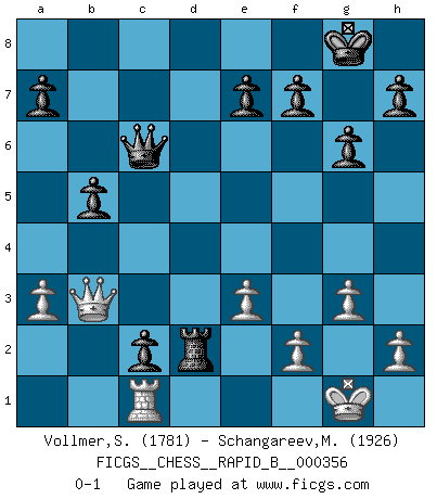 Last move : 0-1 2021 January 23 12:2:52 [Event "FICGS__CHESS__RAPID_B__000356"] [Site "FICGS"] [Date "2020.12.30"] [Round "1"] [White "Vollmer,Steve"] [Black "Schangareev,Mirzian"] [Result "0-1"] [WhiteElo "1781"] [BlackElo "1926"] 1.c4 Nf6 2.Nf3 c5 3.Nc3 Nc6 4.g3 d5 5.cxd5 Nxd5 6.Bg2 g6 7.O-O Bg7 8.Nxd5 Qxd5 9.d3 Bd7 10.Qc2 O-O 11.Be3 b6 12.a3 Qd6 13.Rac1 Rfd8 14.Rfd1 Rac8 15.Qd2 Na5 16.Qc2 Qe6 17.Nd2 Bd4 18.Nc4 Nxc4 19.Bxd4 Nxa3 20.bxa3 cxd4 21.Qb2 Qf6 22.Bb7 Rc3 23.Rxc3 dxc3 24.Qc2 b5 25.d4 Bc6 26.Bxc6 Qxc6 27.Rc1 Rxd4 28.Qb3 c2 29.e3 Rd2 0-1 English Opening Kingside Castling by player White (move 7) Kingside Castling by player Black (move 10) Player Black won this chess game. Follow this game move after move (download)Chess is a terrific way for kids to build self image and self esteem. (Saudin Robovic) Wir können eben der zündenden Macht des Opfers nicht wiederstehen, denn die Begeisterung für das Opfer liegt in der Natur des Menschen. (Rudolf Spielmann) Me gusta decir que Bobby Fischer fue el mejor jugador que jamás haya existido. Pero lo que hizo de Fischer un genio, fue su habilidad de mezclar una frescura y pragmatismo Americano con ideas Rusas acerca de la estrategia. (Bruce Pandolfini) Les écrivains ont utilisé les échecs pour analyser les côtés extrêmes de la nature humaine. Dans ce cadre, les échecs offrent un champ d'expérimentation idéal. Mais on pourrait faire la même chose avec la peinture. Et là, en vous référant à Van Gogh, vous ne tirerez pas de conclusion définitive sur les peintres. (Gary Kasparov) Life is like a game of cards: the hand you are dealt represents determinism; the way you play it is free will. (Jawaharlal Nehru)