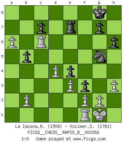 Last move : 1-0 2021 February 14 11:47:6 [Event "FICGS__CHESS__RAPID_B__000356"] [Site "FICGS"] [Date "2020.12.30"] [Round "1"] [White "La Iacona,Alessandro"] [Black "Vollmer,Steve"] [Result "1-0"] [WhiteElo "1908"] [BlackElo "1781"] 1.d4 Nf6 2.c4 e6 3.Nc3 d5 4.Nf3 Be7 5.Bf4 O-O 6.e3 a6 7.cxd5 exd5 8.Bd3 Nc6 9.h3 h6 10.a3 Re8 11.O-O Bd6 12.Bxd6 Qxd6 13.Rc1 b5 14.Qc2 Bb7 15.Ne2 Ne4 16.Bxe4 dxe4 17.Nd2 f5 18.Nb3 Re7 19.Nf4 Rae8 20.Nc5 Nd8 21.a4 Bd5 22.Nxd5 Qxd5 23.Nxa6 Ne6 24.Nb4 Qb7 25.a5 f4 26.Nc6 Ng5 27.Nxe7+ Rxe7 28.Qc6 Qxc6 29.Rxc6 f3 30.a6 1-0 Queen's pawn game Kingside Castling by player Black (move 5) Kingside Castling by player White (move 11) Player White won this chess game. Follow this game move after move (download)A good player is always lucky. (Jose Raul Capablanca) Wenn Du absolut nicht mehr weißt, was Du tun sollst, dann ist es Zeit für Panik. (John van der Wiel) Diferente gente reacciona diferentemente en aceptar la derrota. (Bobby Fischer) La vie et les Echecs sont tous les deux une lutte constante. (Lasker) A journey of a thousand sites begins with a single click. (Author unknown)