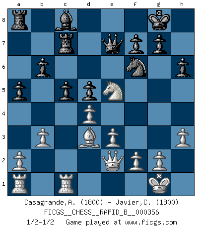 Last move : 1/2-1/2 2021 February 16 12:47:58 [Event "FICGS__CHESS__RAPID_B__000356"] [Site "FICGS"] [Date "2020.12.30"] [Round "1"] [White "Casagrande,Andy"] [Black "Javier,Christian"] [Result "1/2-1/2"] [WhiteElo "1800"] [BlackElo "1800"] 1.d4 d5 2.c4 e6 3.Nf3 Nf6 4.Nc3 Be7 5.Bg5 h6 6.Bh4 O-O 7.e3 b6 8.Bd3 Bb7 9.O-O Nbd7 10.Qe2 dxc4 11.Bxc4 Nd5 12.Nxd5 exd5 13.Bxe7 Qxe7 14.Bd3 c5 15.b3 Rfc8 16.h3 a5 17.Rfd1 Nf6 18.Rdc1 Rc7 19.Ne5 Bc8 1/2-1/2 Queen's gambit declined Kingside Castling by player Black (move 6) Kingside Castling by player White (move 9) This chess game ended in a draw. Follow this game move after move (download)Checkers is for tramps. (Paul Morphy) Weshalb minderdergeübte Spieler mit g2-g4 beginnen? Die betreffenden sind unschlüssig, ob sie nun rechts (h4) oder links (f4) beginnen sollen, und in ihrer Ratlosigkeit entschliessen sie sich nach guter Bürgerart dazu, den goldenen Mittelweg zu wählen. (Aaron Nimzowitsch) El Ajedrez es sobre todo, ¡una pelea!. (Emanuel Lasker) Le système Elo représente seulement une moyenne. Il est simplement un indicateur de votre stabilité. (Anatoli Karpov) Better than a thousand days of diligent study is one day with a great teacher. (Japanese proverb)