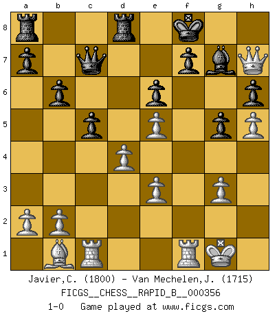 Last move : 1-0 2021 February 13 13:36:53 [Event "FICGS__CHESS__RAPID_B__000356"] [Site "FICGS"] [Date "2020.12.30"] [Round "1"] [White "Javier,Christian"] [Black "Van Mechelen,Jan"] [Result "1-0"] [WhiteElo "1800"] [BlackElo "1715"] 1.d4 Nf6 2.c4 g6 3.Nc3 d5 4.Nf3 Bg7 5.Qb3 dxc4 6.Qxc4 O-O 7.e4 Bg4 8.Be3 Nfd7 9.Qb3 Nb6 10.Rd1 e6 11.Be2 Nc6 12.e5 Ne7 13.h3 Bxf3 14.Bxf3 c6 15.h4 h6 16.h5 g5 17.O-O Qc7 18.Be4 Nbd5 19.Nxd5 Nxd5 20.Bb1 Rfd8 21.g3 c5 22.Rc1 b6 23.Qd3 Nxe3 24.Qh7+ Kf8 25.fxe3 1-0 King's Indian defense, 3.Nc3 Kingside Castling by player Black (move 6) Kingside Castling by player White (move 17) Player White won this chess game. Follow this game move after move (download)One of these modest little moves may be more embarrassing to your opponent than the biggest threat. (Siegbert Tarrasch) Im Wettkampf zwischen starken Meistern kommen Fehler sehr selten vor, deshalb ist es mit bloßem Warten nicht getan. (José Raúl Capablanca) La táctica fluye a partir de una posición superior. (Bobby Fischer) Je crois qu'il existe des manières très spécifiques de jouer efficacement contre une machine. Evidemment, nous n'avons aucune chance en technique pure, parce que l'ordinateur calcule de manière parfaite. Mais lorsque nous faisons appel à notre cerveau, en utilisant l'intuition et la compréhension, alors nous restons beaucoup plus forts. (Anatoli Karpov) If things go wrong, don't go with them. (Roger Babson)