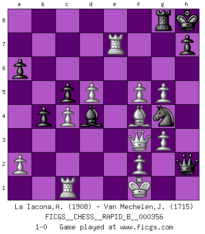 Last move : 1-0 2021 February 6 13:39:13 [Event "FICGS__CHESS__RAPID_B__000356"] [Site "FICGS"] [Date "2020.12.30"] [Round "1"] [White "La Iacona,Alessandro"] [Black "Van Mechelen,Jan"] [Result "1-0"] [WhiteElo "1908"] [BlackElo "1715"] 1.d4 Nf6 2.c4 g6 3.Nc3 d5 4.cxd5 Nxd5 5.e4 Nxc3 6.bxc3 Bg7 7.Bg5 c5 8.Rc1 O-O 9.Nf3 Bg4 10.d5 Qd6 11.Be2 Nd7 12.O-O f5 13.Be3 f4 14.Bd2 Bxf3 15.Bxf3 a6 16.c4 b5 17.Be2 b4 18.g3 g5 19.Bg4 Ne5 20.Bf5 Qh6 21.h4 Rxf5 22.exf5 Kh8 23.Re1 Rg8 24.hxg5 Qh3 25.Bxf4 Ng4 26.Qf3 Bd4 27.Rxe7 Qh2+ 28.Kf1 1-0 King's Indian defense, 3.Nc3 Kingside Castling by player Black (move 8) Kingside Castling by player White (move 12) Player White won this chess game. Follow this game move after move (download)Fischer was a master of clarity and a king of artful positioning. His opponents would see where he was going but were powerless to stop him. (Bruce Pandolfini) Frage des Reporters: -Worin besteht das Ziel von Gambiteröffnungen? Antwort: -Auf Kosten der Partie einen Ruf als Angriffspieler zu erwerben.- (Siegbert Tarrasch) Hay jugadores fuertes y personas amables y yo soy un jugador fuerte. (Bobby Fischer) Le succès, c'est être capable d'aller d'échec en échec sans perdre son enthousiasme. (Winston Churchill) I teach you to lie, cheat and steal, and as soon as my back's turned you wait in line ? (Gregory House, House M.D.)