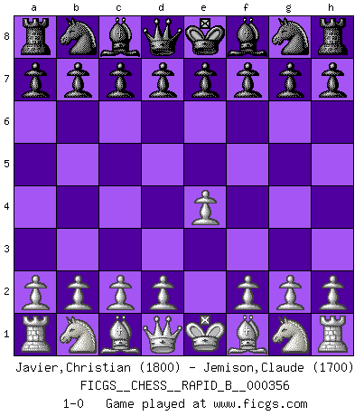 Last move : 1-0 2021 January 29 23:22:11 [Event "FICGS__CHESS__RAPID_B__000356"] [Site "FICGS"] [Date "2020.12.30"] [Round "1"] [White "Javier,Christian"] [Black "Jemison,Claude"] [Result "1-0"] [WhiteElo "1800"] [BlackElo "1700"] 1.e4 1-0 This chess game has been lost on time (started : 2020.12.30 19:22:48) King's pawn Opening Player White won this chess game. Follow this game move after move (download)Chess is imagination. (David Bronstein) Das Spiel gibt uns die Genugtuung, die das Leben uns versagt. (Emanuel Lasker) Te sientas frente a un tablero y repentinamente tu corazón brinca. Tu mano tiembla al tomar una pieza y moverla. Pero lo que el Ajedrez te enseña es que tu debes permanecer ahí con calma y pensar de que si realmente es una buena idea o de que si hay otras ideas mejores. (Stanley Kubrick) Aucun coup ne doit être joué sans but. (Pedro Damiano) Whenever people agree with me, I always feel I must be wrong. (Oscar Wilde)