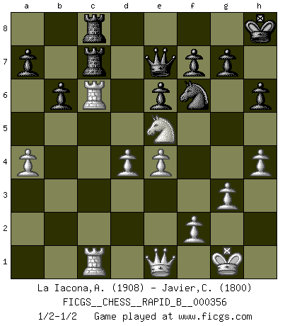 Last move : 1/2-1/2 2021 April 12 15:4:26 [Event "FICGS__CHESS__RAPID_B__000356"] [Site "FICGS"] [Date "2020.12.30"] [Round "1"] [White "La Iacona,Alessandro"] [Black "Javier,Christian"] [Result "1/2-1/2"] [WhiteElo "1908"] [BlackElo "1800"] 1.d4 d5 2.c4 e6 3.Nc3 Nf6 4.Nf3 Nbd7 5.Bg5 h6 6.Bh4 Be7 7.cxd5 Nxd5 8.Bxe7 Qxe7 9.e4 Nxc3 10.bxc3 c5 11.Bd3 O-O 12.O-O Rd8 13.Qb3 Nf6 14.Rfe1 cxd4 15.cxd4 b6 16.a4 Bd7 17.Qb2 Rac8 18.Ba6 Rc7 19.Re3 Qe8 20.Qb4 Qf8 21.Qd2 Bc6 22.Qc1 Qd6 23.Qe1 Qd7 24.Ne5 Qd6 25.Nf3 Nh7 26.h4 Bb7 27.Bxb7 Rxb7 28.Rc3 Rc7 29.Rac1 Rdc8 30.g3 Qe7 31.Ne5 Nf6 32.Rc6 Kh8 1/2-1/2 QGD : 4.Nf3 Kingside Castling by player Black (move 11) Kingside Castling by player White (move 12) This chess game ended in a draw. Follow this game move after move (download)Before the endgame, the Gods have placed the middle game. (Siegbert Tarrasch) Ich brauche nur einen Blick auf das Schachbrett zu werfen, und weiß schon, was in der Stellung steckt, was geschehen kann und was geschehen wird. Alle übrigen suchen und prüfen, ich aber weiß es! (José Raúl Capablanca) Aún deseo matar a Fischer. (Boris Spassky) Tout change constamment, y compris dans le monde des Echecs. (Botvinnik) Creativity is allowing yourself to make mistakes. Art is knowing which ones to keep. (Scott Adams)