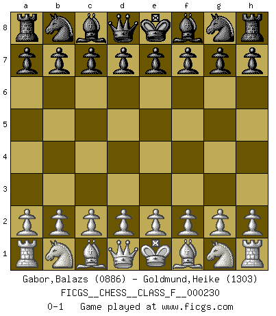 Last move : 0-1 2021 February 10 8:36:52 [Event "FICGS__CHESS__CLASS_F__000230"] [Site "FICGS"] [Date "2020.12.31"] [Round "1"] [White "Gabor,Balazs"] [Black "Goldmund,Heike"] [Result "0-1"] [WhiteElo "0886"] [BlackElo "1303"] 0-1 This chess game has been lost on time (started : 2020.12.31 23:40:19) Player Black won this chess game. Follow this game move after move (download)Some part of a mistake is always correct. (Savielly Tartakover) Jede Eröffnung ist gut genug um gespielt zu werden, wenn nur ihr Ruf schlecht genug ist. (Savielly Grigorievitsch Tartakower) Yo he agregado estos principios a la ley: pongan los Caballos en acción antes de que los dos Alfiles sean desarrollados. (Emanuel Lasker) Un journaliste : 'Vous préférez avoir une dame de plus sur l'échiquier ou au lit ?' Boris Spassky : 'Ca dépend de la position.' There is far too much law for those who can afford it and far too little for those who cannot. (Derek Bok)