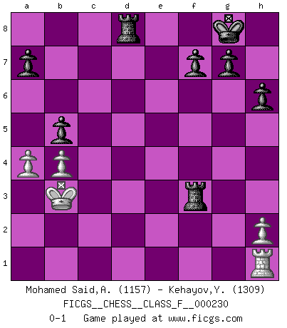 Last move : 0-1 2021 March 10 22:26:18 [Event "FICGS__CHESS__CLASS_F__000230"] [Site "FICGS"] [Date "2020.12.31"] [Round "1"] [White "Mohamed Said,Azaim"] [Black "Kehayov,Yulian"] [Result "0-1"] [WhiteElo "1157"] [BlackElo "1309"] 1.e4 c5 2.Nf3 Nc6 3.d4 cxd4 4.Nxd4 Nf6 5.Nc3 e5 6.Nf3 Bb4 7.Bd2 Bxc3 8.Bxc3 Nxe4 9.Bxe5 Nxe5 10.Nxe5 Qa5+ 11.c3 Qxe5 12.Qe2 Qe6 13.O-O-O O-O 14.Re1 d5 15.Qd3 Qc6 16.Qe3 Bd7 17.Bd3 Rfe8 18.Qf4 h6 19.f3 Nf2 20.Qd2 Nxh1 21.Rxh1 Qd6 22.c4 dxc4 23.Bxc4 Qxd2+ 24.Kxd2 Be6 25.Bxe6 Rxe6 26.Kc2 Rd8 27.a3 Re2+ 28.Kc3 Rxg2 29.b4 Rf2 30.Kb3 b5 31.a4 Rxf3+ 0-1 Sicilian : Pelikan (Lasker/Sveshnikov) variation Queenside Castling by player White (move 13) Kingside Castling by player Black (move 13) Player Black won this chess game. Follow this game move after move (download)A sacrifice is best refuted by accepting it. (Wilhelm Steinitz) Ich kenne keine einzige Person, die behaupten würde, Garri Kasparow sei ein guter Mensch (Nigel Short) Prefiero perder una partida realmente buena, que ganar una mala. (David Levy) Il vaut toujours mieux jouer un plan faux de façon logique que de n'avoir pas de plan du tout. (Victor Kortchnoï) A cynic is a man who knows the price of everything but the value of nothing. (Oscar Wilde)