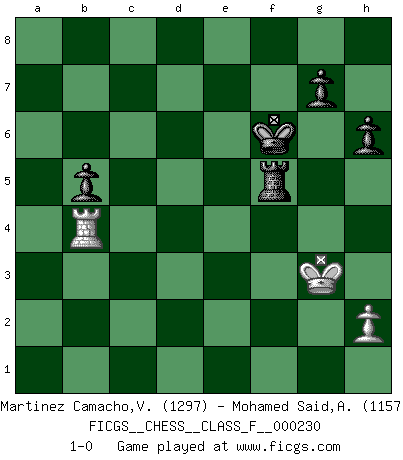 Last move : 1-0 2021 May 26 19:38:17 [Event "FICGS__CHESS__CLASS_F__000230"] [Site "FICGS"] [Date "2020.12.31"] [Round "1"] [White "Martinez Camacho,Victor Hugo"] [Black "Mohamed Said,Azaim"] [Result "1-0"] [WhiteElo "1297"] [BlackElo "1157"] 1.e4 e6 2.f4 b6 3.Nc3 Bb7 4.Be2 Nc6 5.Nf3 Be7 6.O-O f5 7.exf5 exf5 8.d4 Nf6 9.Be3 O-O 10.Ne5 d6 11.Nxc6 Bxc6 12.d5 Bb7 13.Qd2 Ne4 14.Nxe4 fxe4 15.c4 Bf6 16.Rab1 c6 17.dxc6 Bxc6 18.Rfd1 Be7 19.b4 a6 20.a3 a5 21.b5 Bb7 22.Bg4 Qc7 23.Be6+ Kh8 24.a4 Rf6 25.f5 Bc8 26.Bg5 Rf8 27.Bxe7 Qxe7 28.Qxd6 Qf6 29.Bxc8 Raxc8 30.Qxf6 Rxf6 31.g4 e3 32.Re1 Rxc4 33.Rxe3 Rxg4+ 34.Kh1 h6 35.Re8+ Kh7 36.Rf1 Rxa4 37.Re6 Rb4 38.Re5 a4 39.Rg1 Rf7 40.Rc1 a3 41.Ra1 Ra7 42.Re3 a2 43.Re2 Rb1+ 44.Re1 Rxb5 45.Re2 Rba5 46.Rb2 R7a6 47.Kg2 Rxf5 48.R1xa2 Rxa2 49.Rxa2 Kg6 50.Rb2 b5 51.Kg3 Kf6 52.Rb4 1-0 French : Labourdonnais variation Kingside Castling by player White (move 6) Kingside Castling by player Black (move 9) 10 pieces endgame at move 48 : White KRRP , Black KRRPPP WHITE : King + 2 Rooks 1 Pawn BLACK : King + 2 Rooks 3 Pawns 9 pieces endgame at move 48 : White KRP , Black KRRPPP WHITE : King + 1 Rook 1 Pawn BLACK : King + 2 Rooks 3 Pawns 8 pieces endgame at move 49 : White KRP , Black KRPPP WHITE : King + 1 Rook 1 Pawn BLACK : King + 1 Rook 3 Pawns Player White won this chess game. Follow this game move after move (download)When I have White, I win because I am white; When I have Black, I win because I am Bogolyubov. (Bogolyubov) Schon mancher Spieler hat aufgegeben, um zu vermeiden, daß er eine Figur verliert. (Savielly Grigorievitsch Tartakower) El Ajedrez es tortura mental. (Garry Kasparov) Les échecs sont plus proches de l'art de l'assassinat que de l'art de la guerre. (Arturo Perez-Reverte) Programming can only do so much before it becomes too much. (Don Groves)