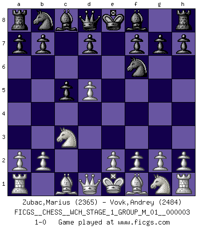 Last move : 1-0 2007 August 17 22:9:49 [Event "FICGS__CHESS__WCH_STAGE_1_GROUP_M_01__000003"] [Site "FICGS"] [Date "2007.07.11"] [Round "1"] [White "Zubac,Marius"] [Black "Vovk,Andrey"] [Result "1-0"] [WhiteElo "2365"] [BlackElo "2484"] 1.d4 Nf6 2.c4 e6 3.Nc3 c5 4.d5 exd5 5.cxd5 1-0 This chess game has been lost on time (started : 2007.07.11 17:27:14) Queen's pawn game Player White won this chess game. Follow this game move after move (download)The King is a fighting piece. Use it ! (Wilhelm Steinitz) Der Knackpunkt bei der Konzentration ist, daß wir nur durch sie etwas Neues und Ungewöhnliches am Schachbrett finden können. Sie ist der einzige Weg durch neue neue Ideen eine Überraschung zu bereiten. (Garry Kasparov) Si tu oponente te ofrece un empate, trata de averiguar porque piensa él que esta en una posición peor. (Nigel Short) La tactique est l'élément le plus important du milieu de jeu. (Siegbert Tarrasch) Players are not good because they find tactics, it is about the way to find the positions in which those tactics are hidden. (Luc-Olivier Leclerc)