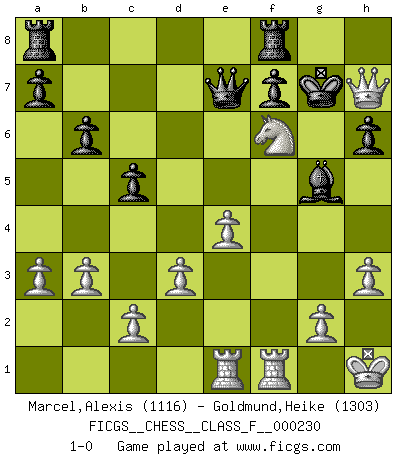 Last move : 1-0 2021 March 7 19:39:5 [Event "FICGS__CHESS__CLASS_F__000230"] [Site "FICGS"] [Date "2020.12.31"] [Round "1"] [White "Marcel,Alexis"] [Black "Goldmund,Heike"] [Result "1-0"] [WhiteElo "1116"] [BlackElo "1303"] 1.f4 Nf6 2.Nf3 b6 3.e3 Bb7 4.Be2 e6 5.O-O Be7 6.b3 O-O 7.Bb2 c5 8.Nc3 d6 9.Qe1 Nbd7 10.a3 Ne4 11.Nxe4 Bxe4 12.d3 Bb7 13.e4 Nf6 14.Qd2 Qc7 15.Rae1 h6 16.h3 e5 17.fxe5 dxe5 18.Bxe5 Bd6 19.Bxf6 Bf4 20.Qc3 gxf6 21.Qxf6 Be3+ 22.Kh1 Kh7 23.Nh4 Bg5 24.Qf5+ Kg7 25.Nf3 Be3 26.Nh2 Bc8 27.Qf6+ Kh7 28.Bg4 Bxg4 29.Nxg4 Bg5 30.Qf5+ Kg7 31.Nf6 Qe7 32.Qh7+ 1-0 Bird's Opening Kingside Castling by player White (move 5) Kingside Castling by player Black (move 6) Player White won this chess game. Follow this game move after move (download)Chess is war over the board. The object is to crush the opponents mind. (Bobby Fischer) Ohne Leiden bildet sich kein Charakter. (Ernst Freiherr von Feuchtersleben) Yo siempre he tenido un ligero sentimiento de lástima por una persona que no tiene conocimiento del Ajedrez. (Siegbert Tarrasch) À la honte des hommes, on sait que les lois du jeu sont les seules qui soient partout justes, claires, inviolables et exécutées. Pourquoi l'Indien qui a donné les règles du jeu d'échecs est-il obéi de bon gré dans toute la terre, et que les décrétales des papes, par exemple, sont aujourd'hui un objet d'horreur et de mépris ? C'est que l'inventeur des échecs combina tout avec justesse pour la satisfaction des joueurs, et que les papes, dans leurs décrétales, n'eurent en vue que leur seul avantage. L'Indien voulut exercer également l'esprit des hommes et leur donner du plaisir; les papes ont voulu abrutir l'esprit des hommes. Voltaire (Dictionnaire philosophique / Garnier 1967) All the biggest technological inventions created by man - the airplane, the automobile, the computer - says little about his intelligence, but speaks volumes about his laziness. (Mark Kennedy)