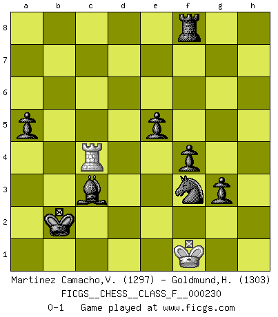 Last move : 0-1 2021 May 7 13:29:18 [Event "FICGS__CHESS__CLASS_F__000230"] [Site "FICGS"] [Date "2020.12.31"] [Round "1"] [White "Martinez Camacho,Victor Hugo"] [Black "Goldmund,Heike"] [Result "0-1"] [WhiteElo "1297"] [BlackElo "1303"] 1.e4 d5 2.exd5 Qxd5 3.Nc3 Qa5 4.d4 Nf6 5.Nf3 Bg4 6.Be2 e6 7.O-O c6 8.Bd2 Nbd7 9.Nd5 Qxd5 10.h3 Bf5 11.Nh4 Bg6 12.Nxg6 hxg6 13.c4 Qxd4 14.Bc3 Qf4 15.Qd4 Qxd4 16.Bxd4 O-O-O 17.Rfd1 Kb8 18.Rab1 Bd6 19.a3 Ne5 20.c5 Bc7 21.b4 Nd5 22.Kf1 Nf4 23.Bxe5 Bxe5 24.Bf3 Nd5 25.Re1 Bc3 26.Re2 Nf4 27.Re3 Bd4 28.Reb3 f6 29.Rc1 e5 30.b5 cxb5 31.Rxb5 Nd3 32.Rxb7+ Kc8 33.Rcb1 Bxc5 34.Rb8+ Kc7 35.R8b7+ Kd6 36.Rxg7 g5 37.Be2 Nf4 38.Bg4 Bb6 39.Rd1+ Kc6 40.Bd7+ Kc5 41.Rc1+ Kd4 42.Bf5 Rhf8 43.Rd1+ Kc3 44.Ra1 Rd2 45.Rc1+ Kb2 46.Rb1+ Kxa3 47.Ra1+ Kb2 48.Rb1+ Ka2 49.Rc1 Rxf2+ 50.Ke1 Rxg2 51.Rc2+ Rxc2 52.Bxc2 Nxh3 53.Bf5 Nf4 54.Rd7 Bd4 55.Rc7 a5 56.Bc2 f5 57.Rc4 g4 58.Ra4+ Kb2 59.Bd1 Bc3+ 60.Kf1 Nd3 61.Rc4 g3 62.Kg2 f4 63.Bf3 Ne1+ 64.Kf1 Nxf3 0-1 Scandinavian (centre counter) defense Kingside Castling by player White (move 7) Queenside Castling by player Black (move 16) 10 pieces endgame at move 64 : White KR , Black KRBNPPPP WHITE : King + 1 Rook BLACK : King + 1 Rook 1 Bishop 1 Knight 4 Pawns Player Black won this chess game. Follow this game move after move (download)Chess is a part of culture and if a culture is declining then Chess too will decline. (Mikhail Botvinnik) Ich würde mich als ganz normalen Jungen bezeichnen [Im Alter von 12]. (Sergej Karjakin) El pensamiento metódico es mas útil en el Ajedrez que la inspiración. (C. J. S. Purdy) Avec des compensations pour le matériel en plus... (Anonyme) To be champion requires more than simply being a strong player; one has to be a strong human being as well. (Anatoly Karpov)