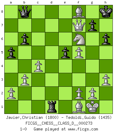 Last move : 1-0 2021 May 27 20:17:44 [Event "FICGS__CHESS__CLASS_D__000273"] [Site "FICGS"] [Date "2021.01.01"] [Round "1"] [White "Javier,Christian"] [Black "Tedoldi,Guido"] [Result "1-0"] [WhiteElo "1800"] [BlackElo "1435"] 1.e4 c5 2.Nf3 Nc6 3.d4 cxd4 4.Nxd4 e5 5.Nb5 d6 6.c4 a6 7.N5c3 Nf6 8.Be2 h6 9.O-O Be7 10.Na3 O-O 11.Nc2 Be6 12.b3 Rc8 13.Bb2 Re8 14.Qd3 Nd7 15.Rfd1 Nc5 16.Qf3 Bf6 17.Bf1 Bg5 18.h3 a5 19.Nb5 Be7 20.Ba3 b6 21.Rd2 Nb7 22.Rad1 Bg5 23.Ne3 Re7 24.Nxd6 Nd4 25.Rxd4 Rd7 26.Nxb7 Qc7 27.Rxd7 Bxd7 28.Nd6 Rd8 29.Qxf7+ Kh8 30.Ndf5 Bf6 31.Nd5 Qb8 32.Nxf6 Bxf5 33.exf5 Rxd1 34.Bf8 1-0 Sicilian : Labourdonnais-Loewenthal (Kalashnikov) variation Kingside Castling by player White (move 9) Kingside Castling by player Black (move 10) Player White won this chess game. Follow this game move after move (download)I'm not a materialistic person, in that, I don't suffer the lack or loss of money. The absence of worldly goods I don't look back on. For Chess is a way I can be as materialistic as I want without having to sell my soul. (Jamie Walter Adams) Modernes Schach erfordert enorme Anspannung. Es ist für einen normalen Menschen unmöglich das auszuhalten. (Viktor Kortschnoi) Con el tiempo, empecé a progresar en partidas decisivas. Tal vez porque me di cuenta de una simple verdad: no solo estaba yo nervioso sino también mi oponente. (Mikhail Tal) Aux échecs, les retours au sommet sont rares : les dommages psychologiques consécutifs à une défaite sont trop sévères. (Daily Telegraph) There are lots of people who mistake their imagination for their memory. (Josh Bilings)