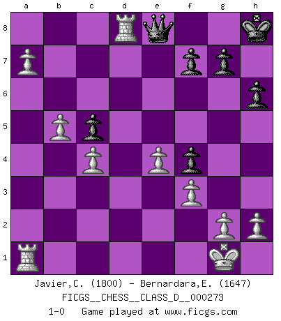 Last move : 1-0 2021 February 13 10:55:2 [Event "FICGS__CHESS__CLASS_D__000273"] [Site "FICGS"] [Date "2021.01.01"] [Round "1"] [White "Javier,Christian"] [Black "Bernardara,Enos"] [Result "1-0"] [WhiteElo "1800"] [BlackElo "1647"] 1.e4 c5 2.Nf3 Nc6 3.d4 cxd4 4.Nxd4 e5 5.Nb5 d6 6.c4 Nf6 7.N5c3 Be7 8.Be2 O-O 9.O-O Nd4 10.Be3 Nxe2+ 11.Qxe2 b6 12.Rd1 Bb7 13.f3 Rc8 14.Qd3 Ba6 15.b3 h6 16.a4 Nh5 17.Nd5 Re8 18.Nxe7+ Qxe7 19.Nc3 Red8 20.a5 Nf4 21.Bxf4 exf4 22.axb6 Bb7 23.bxa7 Qf8 24.Nd5 Bxd5 25.Qxd5 Kh8 26.b4 Qe8 27.b5 Rc5 28.Qxc5 dxc5 29.Rxd8 1-0 Sicilian : Labourdonnais-Loewenthal (Kalashnikov) variation Kingside Castling by player Black (move 8) Kingside Castling by player White (move 9) Player White won this chess game. Follow this game move after move (download)One bad move nullifies forty good ones. (Horowitz) Ein Buch ist ein Spiegel; wenn ein Affe hineinsieht, so kann kein Apostel heraus gucken. (Georg Christoph Lichtenberg) Un Peón pasado aumenta su poder a medida de que el número de piezas en el tablero disminuye. (Capablanca) Karpov est une pièce de musée. (Garry Kasparov) You can only get smarter by playing a smarter opponent. (Revolver, movie)
