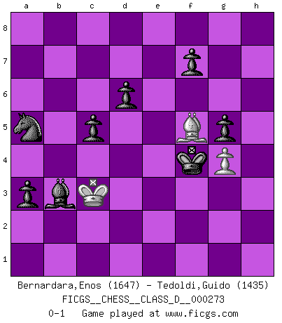 Last move : 0-1 2021 February 25 19:15:23 [Event "FICGS__CHESS__CLASS_D__000273"] [Site "FICGS"] [Date "2021.01.01"] [Round "1"] [White "Bernardara,Enos"] [Black "Tedoldi,Guido"] [Result "0-1"] [WhiteElo "1647"] [BlackElo "1435"] 1.Nf3 c5 2.c4 Nc6 3.e3 e5 4.Nc3 d6 5.a3 Nf6 6.d3 Be7 7.Be2 O-O 8.O-O h6 9.b3 a6 10.Nd5 b5 11.Nxe7+ Qxe7 12.Bb2 bxc4 13.bxc4 Rb8 14.Re1 Rxb2 15.Qc1 Qb7 16.Rb1 Rxb1 17.Qxb1 Qc7 18.h3 Be6 19.Qc2 Rb8 20.Rb1 Qd7 21.Nd2 Qc8 22.Bf3 Ne7 23.a4 Rb4 24.Qc3 Rxb1+ 25.Nxb1 Nc6 26.Na3 Nb4 27.e4 Ne8 28.g4 Qd8 29.Nc2 Nxc2 30.Qxc2 h5 31.Bd1 hxg4 32.hxg4 Nf6 33.f3 Nh7 34.Qh2 Qg5 35.Be2 Bd7 36.a5 Qc1+ 37.Kf2 Qa1 38.f4 exf4 39.Qxf4 Qf6 40.Qxf6 Nxf6 41.Kg3 g5 42.Kh3 Bc6 43.Kg3 Nd7 44.Bd1 Ne5 45.Be2 Ba4 46.Kf2 Nc6 47.Ke3 Nxa5 48.d4 Nb7 49.d5 Kg7 50.Kd3 Kf6 51.Kd2 Ke5 52.Ke3 Bc2 53.Bf3 a5 54.Kd2 Bb3 55.Kd3 a4 56.Be2 a3 57.Kc3 Na5 58.Bf1 Kxe4 59.Bd3+ Kf4 60.Bf5 Bxc4 61.Bd7 Bxd5 62.Bf5 Bb3 0-1 Reti Opening Kingside Castling by player Black (move 7) Kingside Castling by player White (move 8) Player Black won this chess game. Follow this game move after move (download)Chess makes man wiser and clear-sighted. (Vladimir Putin) Bobby Fischer ist kein Vorbild für die heutige Jugend. (Viktor Kortschnoi) Robert Fischer es la ley hacia si mismo. (Larry Evans) Botvinnik disait en comparant les échecs à la musique: Il existe une science dont le but est l'étude de l'acoustique et des sons. Mais il y a aussi un art qui se sert de l'océan des sons : c'est la musique. De toute évidence, il en est de même pour la pensée. La logique est l'étude des lois de la réflexion et les échecs reflètent, en tant qu'art, le côté logique de la réflexion, sous la forme d'images artistiques... Extrait de Fischer - Spassky, Reykjavik 1972 par Alexander & F. Wyndham (Ed. Solar), p 37. Quotation,n.: The act of repeating erroneously the words of another. The words erroneously repeated. (Ambrose Bierce, The Devil's Dictionary)