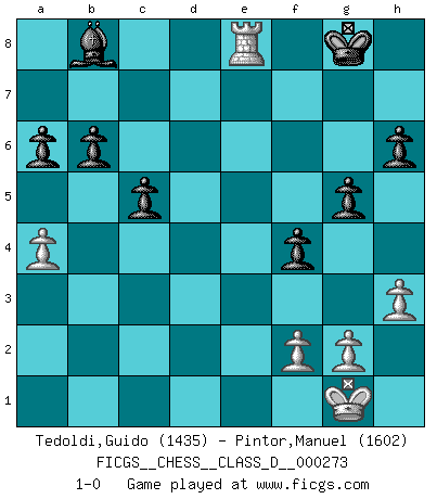 Last move : 1-0 2021 February 28 17:32:34 [Event "FICGS__CHESS__CLASS_D__000273"] [Site "FICGS"] [Date "2021.01.01"] [Round "1"] [White "Tedoldi,Guido"] [Black "Pintor,Manuel"] [Result "1-0"] [WhiteElo "1435"] [BlackElo "1602"] 1.c4 e5 2.Nc3 Bc5 3.Nf3 Nc6 4.e3 d6 5.d3 Nf6 6.h3 O-O 7.a3 h6 8.Be2 a6 9.O-O Ne7 10.Nh2 c6 11.b4 Ba7 12.Bb2 Ng6 13.a4 Nh4 14.Nf3 Nxf3+ 15.Bxf3 Nh7 16.Ne4 f5 17.Ng3 g6 18.Bc3 Qg5 19.c5 dxc5 20.Bxe5 cxb4 21.Qb3+ Rf7 22.Qxb4 Qe7 23.Qxe7 Rxe7 24.d4 Ng5 25.Be2 Nf7 26.Bc4 Be6 27.Bxe6 Rxe6 28.Bf4 g5 29.Bc7 Rc8 30.Ba5 f4 31.Nf5 c5 32.d5 Re5 33.d6 Rxf5 34.Rad1 b6 35.Bc3 Rd8 36.e4 Re5 37.Bxe5 Nxe5 38.Rd5 Nd7 39.e5 Nxe5 40.Rxe5 Rxd6 41.Rfe1 Rd7 42.Re7 Rxe7 43.Rxe7 Bb8 44.Re8+ 1-0 English Opening Kingside Castling by player Black (move 6) Kingside Castling by player White (move 9) Player White won this chess game. Follow this game move after move (download)There are two types of sacrifices: correct ones and mine. (Mikhail Tal) Wenn Du einsam bist, wenn Du Dich in der Welt wie ein Fremder fühlst, spiele Schach. Das wird Deinen Geist erheben und Dein Ratgeber im Kampf sein. (Aristoteles) El Ajedrez es tan interesante por sí solo, que no es necesario un interés monetario para persuadir a una persona a que lo practique; por lo tanto, nunca se juega por dinero. (Benjamin Franklin) Je fais ceci parce que dans cinquante coups j'obtiendrai cela; je m'appelle Mikhail Moisevitch Botvinnik. (Botvinnik) I live to kill Traxler counterattack. (Ilmars Cirulis)