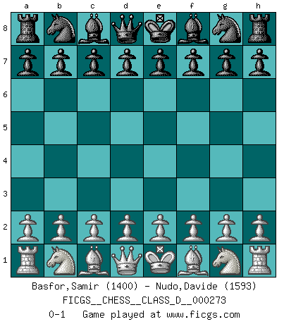 Last move : 0-1 2021 February 10 8:36:52 [Event "FICGS__CHESS__CLASS_D__000273"] [Site "FICGS"] [Date "2021.01.01"] [Round "1"] [White "Basfor,Samir"] [Black "Nudo,Davide"] [Result "0-1"] [WhiteElo "1400"] [BlackElo "1593"] 0-1 This chess game has been lost on time (started : 2021.01.01 1:21:47) Player Black won this chess game. Follow this game move after move (download)The passed pawn is a criminal, who should be kept under lock and key. Mild measures, such as police surveillance, are not sufficient. (Nimzovitch) Ich verachte Kasparow. (Viktor Kortschnoi) En el tablero, la mentira e hipocresía no sobreviven mucho. (Emanuel Lasker) Fischer est le meilleur joueur du monde et Karpov n'est qu'un joueur de bistrot. (Garry Kasparov, agé de 16 ans) Nowadays, anyone who cannot speak English and is incapable of using the Internet is regarded as backward. (Al-Waleed bin Talal)