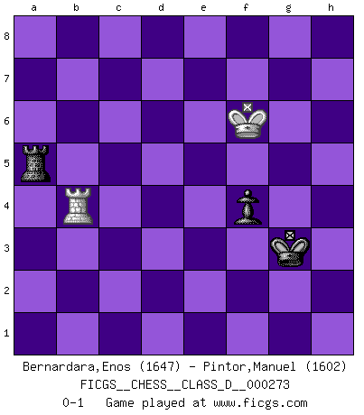 Last move : 0-1 2021 February 22 9:57:29 [Event "FICGS__CHESS__CLASS_D__000273"] [Site "FICGS"] [Date "2021.01.01"] [Round "1"] [White "Bernardara,Enos"] [Black "Pintor,Manuel"] [Result "0-1"] [WhiteElo "1647"] [BlackElo "1602"] 1.Na3 e5 2.c4 Bc5 3.e3 Nc6 4.Nf3 Qf6 5.Qc2 Nb4 6.Qe4 d6 7.Nb5 Bb6 8.a3 Nc6 9.b4 Bf5 10.Qh4 a6 11.Nc3 Qg6 12.Nd5 Nf6 13.Qg5 Nxd5 14.cxd5 Ne7 15.Bc4 Qxg5 16.Nxg5 O-O 17.O-O Ng6 18.Bb2 h6 19.Nf3 f6 20.d4 e4 21.Nd2 Nh4 22.Rfe1 a5 23.Be2 Bg6 24.g3 Nf3+ 25.Nxf3 exf3 26.Bxf3 axb4 27.axb4 Kh7 28.Rec1 Bd3 29.Bg2 f5 30.Bf1 Be4 31.Bg2 g5 32.f3 Bxd5 33.h3 Rxa1 34.Rxa1 f4 35.e4 Bc6 36.g4 Kg6 37.Kf1 Bb5+ 38.Ke1 c5 39.bxc5 dxc5 40.dxc5 Bxc5 41.Ba3 b6 42.Bxc5 bxc5 43.Bf1 Bxf1 44.Kxf1 Rf6 45.Ke2 Rc6 46.Rc1 Kf6 47.Kd3 Ke5 48.Kc4 Rc8 49.Rd1 Rc7 50.Rd5+ Ke6 51.Rf5 Rc8 52.Rxc5 Ra8 53.Rc6+ Ke5 54.Rc5+ Kd6 55.Rf5 Ke6 56.Rb5 Ra3 57.Rb6+ Ke5 58.Rxh6 Rxf3 59.Rh5 Kxe4 60.Rxg5 Rxh3 61.Rd5 Rg3 62.Rd4+ Kf3 63.Kd5 Rxg4 64.Ke5 Rg5+ 65.Kf6 Ra5 66.Rb4 Kg3 0-1 Durkin's attack Kingside Castling by player Black (move 16) Kingside Castling by player White (move 17) 10 pieces endgame at move 58 : White KRPPPP , Black KRPP WHITE : King + 1 Rook 4 Pawns BLACK : King + 1 Rook 2 Pawns 9 pieces endgame at move 58 : White KRPPP , Black KRPP WHITE : King + 1 Rook 3 Pawns BLACK : King + 1 Rook 2 Pawns 8 pieces endgame at move 59 : White KRPP , Black KRPP WHITE : King + 1 Rook 2 Pawns BLACK : King + 1 Rook 2 Pawns 7 pieces endgame at move 60 : White KRPP , Black KRP WHITE : King + 1 Rook 2 Pawns BLACK : King + 1 Rook 1 Pawn 6 pieces endgame at move 60 : White KRP , Black KRP WHITE : King + 1 Rook 1 Pawn BLACK : King + 1 Rook 1 Pawn 5 pieces endgame at move 63 : White KR , Black KRP WHITE : King + 1 Rook BLACK : King + 1 Rook 1 Pawn Player Black won this chess game. Follow this game move after move (download)Fischer wanted to give the Russians a taste of their own medicine. (Larry Evans) Ich las kürzlich ein Buch von Nietzsche. Er sagte Religion verdumme nur die Menschen. Ich stimme zu. (Robert James Fischer) Cuando tu no sabes absolutamente que mas hacer, es tiempo de entrar en pánico. (John van der Wiel) J'apprécie les joueurs d'est-indienne, c'est grâce à eux que je nourris ma famille depuis tant d'années. (Petrosian) I just play for fun. (Anna Kournikova)