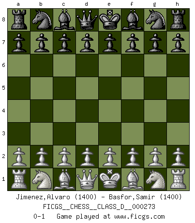 Last move : 0-1 2021 February 10 8:36:52 [Event "FICGS__CHESS__CLASS_D__000273"] [Site "FICGS"] [Date "2021.01.01"] [Round "1"] [White "Jimenez,Alvaro"] [Black "Basfor,Samir"] [Result "0-1"] [WhiteElo "1400"] [BlackElo "1400"] 0-1 This chess game has been lost on time (started : 2021.01.01 1:21:47) Player Black won this chess game. Follow this game move after move (download)Chess is a terrific way for kids to build self image and self esteem. (Saudin Robovic) Stelle das Brett so, daß die Sonne in die Augen deines Gegners scheint. (Ruy López) Aquel que toma al Peón de Caballo de la Reina, se pasará la noche a dormir en la calle. (Anónimo) Aux échecs, les retours au sommet sont rares : les dommages psychologiques consécutifs à une défaite sont trop sévères. (Daily Telegraph) The existence of forgetting has never been proved: We only know that some things don't come to mind when we want them. (Friedrich Nietzsche)