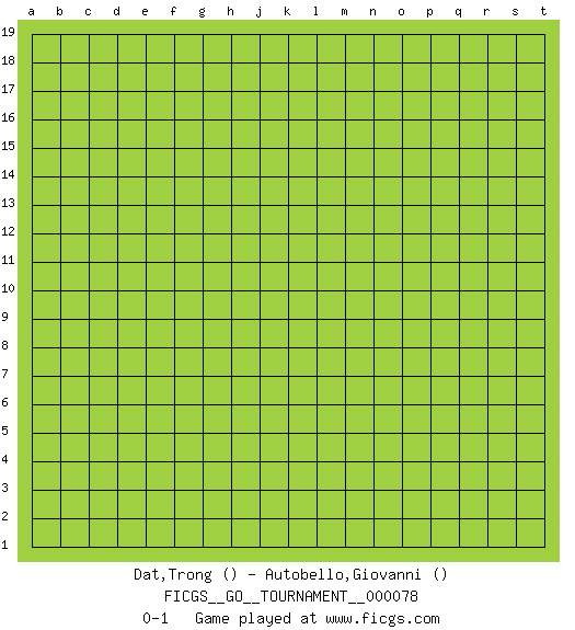Last move : 0-1 2021 January 31 14:10:57 [Event "FICGS__GO__TOURNAMENT__000078"] [Site "FICGS"] [Date "2021.01.01"] [Round "1"] [Black "Dat,Trong"] [White "Autobello,Giovanni"] [Result "0-1"] 0-1 This go game has been lost on time (started : 2021.01.01 1:22:3) Here are the names of the openings (joseki) played in the four corners : Player White won this Go (weiqi, baduk) game. Follow this game move after move (download)Big groups never die. (Anonymous) At work, the authority of a person is inversely proportional to the number of pens that person is carrying. (Dan Rotaru)