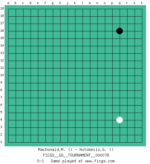 Last move : 0-1 2021 February 1 15:29:23 [Event "FICGS__GO__TOURNAMENT__000078"] [Site "FICGS"] [Date "2021.01.01"] [Round "1"] [Black "MacDonald,Murdo"] [White "Autobello,Giovanni"] [Result "0-1"] 1.q16 q4 0-1 This go game has been lost on time (started : 2021.01.01 1:22:3) Here are the names of the openings (joseki) played in the four corners : Corner q4 : q4 0-1 Hoshi (Hwajeom, Seongjeom, Xingwei`) 4-4 Point. The star or hoshi (4-4) point, emphasizing influence at the potential expense of territory. Player White won this Go (weiqi, baduk) game. Follow this game move after move (download)If your stone is capped, play the knight's move. (Anonymous) Always be a first-rate version of yourself, instead of a second-rate version of somebody else. (Judy Garland)