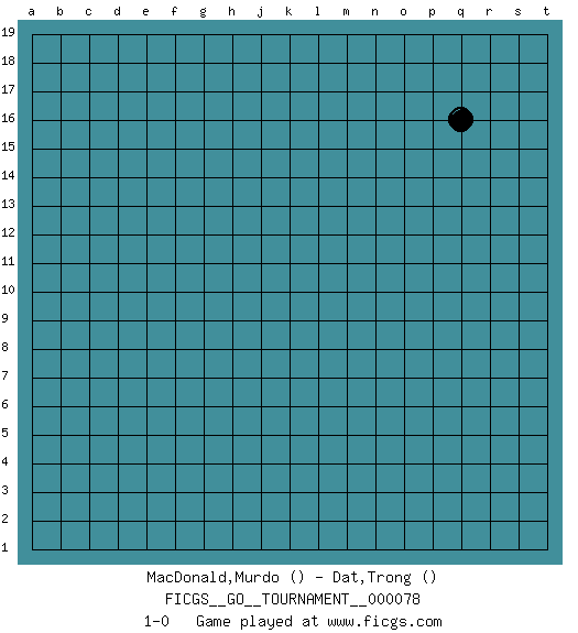 Last move : 1-0 2021 January 31 14:10:57 [Event "FICGS__GO__TOURNAMENT__000078"] [Site "FICGS"] [Date "2021.01.01"] [Round "1"] [Black "MacDonald,Murdo"] [White "Dat,Trong"] [Result "1-0"] 1.q16 1-0 This go game has been lost on time (started : 2021.01.01 1:22:3) Here are the names of the openings (joseki) played in the four corners : Player Black won this Go (weiqi, baduk) game. Follow this game move after move (download)The rectangular six is normally alive. (Anonymous) There's no money in correspondence chess. (John Knudsen)