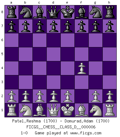 Last move : 1-0 2006 August 2 3:25:5 [Event "FICGS__CHESS__CLASS_D__000006"] [Site "FICGS"] [Date "2006.06.22"] [Round "1"] [White "Patel,Reshma"] [Black "Domurad,Adam"] [Result "1-0"] [WhiteElo "1700"] [BlackElo "1700"] 1.f4 1-0 This chess game has been lost on time (started : 2006.06.22 19:23:24) Bird's Opening Player White won this chess game. Follow this game move after move (download)I thought the most common mistake [in chess] was the first one: Learning the game :P (Garvin Gray, FICGS forum) Das Zentrum ist der Balkan des Schachbretts - Kriegshandlungen können in jedem Moment ausbrechen. (Aaron Nimzowitsch) No hay precio que sea tan grande por la cabellera del Rey enemigo. (Koblentz) J'ai vu le vaincu d'Echecs jouer des années durant dans l'espoir de la fête de la victoire. Car tu es plus riche de ce qu'elle existe si même elle n'est point pour toi. Ainsi de la perle du fond des mers. (Antoine de Saint-Exupéry) Hardware: the parts of a computer that can be kicked. (Jeff Persis)