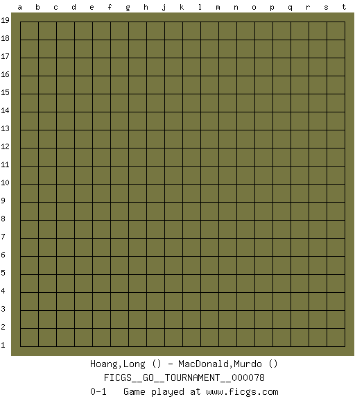 Last move : 0-1 2021 January 31 14:10:57 [Event "FICGS__GO__TOURNAMENT__000078"] [Site "FICGS"] [Date "2021.01.01"] [Round "1"] [Black "Hoang,Long"] [White "MacDonald,Murdo"] [Result "0-1"] 0-1 This go game has been lost on time (started : 2021.01.01 1:22:3) Here are the names of the openings (joseki) played in the four corners : Player White won this Go (weiqi, baduk) game. Follow this game move after move (download)If you don't know ladders, don't play go. (Anonymous) To err is human, but to really foul things up requires a computer. (Farmer's Almanac, 1978)