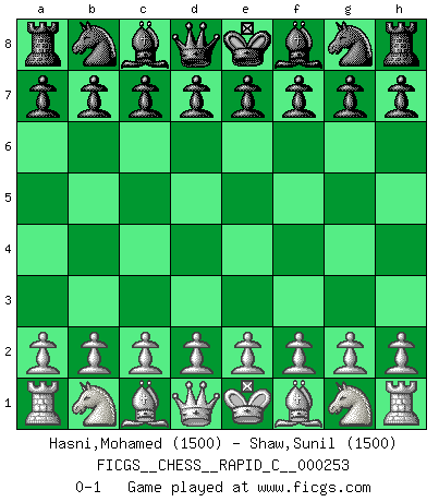 Last move : 0-1 2021 February 2 5:23:57 [Event "FICGS__CHESS__RAPID_C__000253"] [Site "FICGS"] [Date "2021.01.02"] [Round "1"] [White "Hasni,Mohamed"] [Black "Shaw,Sunil"] [Result "0-1"] [WhiteElo "1500"] [BlackElo "1500"] 0-1 This chess game has been lost on time (started : 2021.01.02 20:28:17) Player Black won this chess game. Follow this game move after move (download)He who takes the Queen's Knight's Pawn will sleep in the streets. (Anonymous) Die Neutralität betrachte ich als eine schwere Krankheit. (Viktor Kortschnoi) Un juego de Ajedrez es un dialogo, una conversación entre un jugador y su oponente. Cada movimiento del oponente puede contener amenazas o tropiezos, pero un jugador no se puede defender de las amenazas o tomar ventaja de los tropiezos si es que no se pregunta a sí mismo: ¿Que es lo que mi oponente va a hacer después de cada movida?. (Bruce A. Moon) Je ne crois pas en la psychologie, je crois aux bons coups. (Robert Fischer) Locking firmely the window serves nothing, only small thiefs pass through there, the big thiefs enter through the front door. (Luc-Olivier Leclerc)