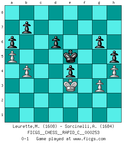Last move : 0-1 2021 January 12 15:45:28 [Event "FICGS__CHESS__RAPID_C__000253"] [Site "FICGS"] [Date "2021.01.02"] [Round "1"] [White "Leurette,Marc-Antoine"] [Black "Sorcinelli,Andrea"] [Result "0-1"] [WhiteElo "1608"] [BlackElo "1684"] 1.e4 c5 2.Nf3 d6 3.Bb5+ Bd7 4.Bxd7+ Qxd7 5.d4 cxd4 6.Qxd4 Nc6 7.Qd3 g6 8.Nc3 Bg7 9.Bd2 Nb4 10.Qb5 Nxc2+ 11.Ke2 Nxa1 12.Qxd7+ Kxd7 13.Rxa1 Bxc3 14.Bxc3 Nf6 15.e5 Nd5 16.e6+ fxe6 17.Bxh8 Rxh8 18.Rd1 Rc8 19.g3 Rc5 20.Rd2 Nf6 21.Ne1 e5 22.Nd3 Rd5 23.f3 e4 24.fxe4 Nxe4 25.Rd1 Nc5 26.Nxc5+ Rxc5 27.b3 Rc2+ 28.Rd2 Rxd2+ 29.Kxd2 Ke6 30.a4 Kd5 31.Kd3 e5 32.h4 h5 33.b4 a6 34.a5 e4+ 35.Ke3 Ke5 0-1 Sicilian : Canal-Sokolsky attack, 3...Bd7 Player Black won this chess game. Follow this game move after move (download)Chess is a beautiful mistress. (Bent Larsen) Ein Kibitz ist einer, der deinem Gegner gute Ratschläge gibt. (Andrew Soltis) Una buena ofensiva y una buena defensa, comienzan ambas con un buen desarrollo. (Bruce A. Moon) Mon pion favori sur ma case favorite ! Bronstein en parlant d'un coup de pion en h5 quand il avait les Noirs. The Internet is the first thing that humanity has build that humanity doesn't understand, the largest experiment in anarchy that we have ever had. (Eric Schmidt)