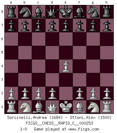 Last move : 1-0 2021 February 2 5:23:57 [Event "FICGS__CHESS__RAPID_C__000253"] [Site "FICGS"] [Date "2021.01.02"] [Round "1"] [White "Sorcinelli,Andrea"] [Black "Ottoni,Alex"] [Result "1-0"] [WhiteElo "1684"] [BlackElo "1500"] 1.e4 1-0 This chess game has been lost on time (started : 2021.01.02 20:28:17) King's pawn Opening Player White won this chess game. Follow this game move after move (download)We cannot resist the fascination of sacrifice, since a passion for sacrifices is part of a Chessplayer's nature. (Rudolf Spielman) Schach ist das Spiel, das die Verrückten gesund hält. (Albert Einstein) Si pudieramos observar el interior de la cabeza de un jugador de Ajedrez, encontraríamos ahí un mundo lleno de sentimientos, imágenes, ideas, emoción y pasión. (Alfred Binet) Le pion, dans sa simplicité, marche droit devant lui, mais lorsqu'il prend, il le fait obliquement? Ainsi l'homme, tant qu'il reste pauvre, marche dans la droiture et vit honnêtement, mais lorsqu'il recherche les honneurs, il flatte, se parjure et, par les voies obliques, cherche une position supérieure sur l'échiquier du monde. (Jean de Galles) He is a liar. I just don't know what the lie is yet. (Horatio Caine, C.S.I. Miami)