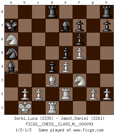 Last move : 1/2-1/2 2021 June 17 12:16:11 [Event "FICGS__CHESS__CLASS_M__000093"] [Site "FICGS"] [Date "2021.01.03"] [Round "1"] [White "Sorbi,Luca"] [Black "Jabot,Daniel"] [Result "1/2-1/2"] [WhiteElo "2235"] [BlackElo "2261"] 1.e4 c5 2.Nf3 d6 3.d4 cxd4 4.Nxd4 Nf6 5.Nc3 Nc6 6.Bg5 e6 7.Qd2 a6 8.O-O-O Bd7 9.f4 Be7 10.Nf3 b5 11.Bxf6 gxf6 12.Kb1 Qb6 13.Bd3 O-O-O 14.Rhe1 Kb8 15.a4 Na5 16.Qe3 Qxe3 17.Rxe3 b4 18.Na2 Ka7 19.Nxb4 d5 20.Nxa6 Bxa4 21.f5 d4 22.Re2 e5 1/2-1/2 Sicilian : Richter-Rauzer, Rauzer attack, 7...a6 Queenside Castling by player White (move 8) Queenside Castling by player Black (move 13) This chess game ended in a draw. Follow this game move after move (download)The essence of Chess is thinking about what Chess is. (David Bronstein) Jeder Schachmeister war einmal ein Anfänger. (Irving Chernev) Durante una competencia de Ajedrez, un Maestro de Ajedrez deberá ser una combinación de presa de caza y un Monge. (Alexander Alekhine) J'ai vu le vaincu d'Echecs jouer des années durant dans l'espoir de la fête de la victoire. Car tu es plus riche de ce qu'elle existe si même elle n'est point pour toi. Ainsi de la perle du fond des mers. (Antoine de Saint-Exupéry) Establishing goals is all right if you don't let them deprive you of interesting detours. (Doug Larson)