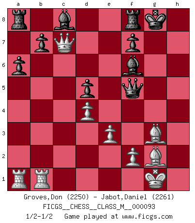 Last move : 1/2-1/2 2021 April 20 21:16:16 [Event "FICGS__CHESS__CLASS_M__000093"] [Site "FICGS"] [Date "2021.01.03"] [Round "1"] [White "Groves,Don"] [Black "Jabot,Daniel"] [Result "1/2-1/2"] [WhiteElo "2250"] [BlackElo "2261"] 1.d4 Nf6 2.Nf3 d5 3.c4 e6 4.Nc3 Be7 5.Bf4 O-O 6.e3 c5 7.dxc5 Bxc5 8.Qc2 Nc6 9.Rd1 Qa5 10.a3 Be7 11.Be2 Ne4 12.cxd5 Nxc3 13.bxc3 exd5 14.O-O Bf6 15.Nd4 Nxd4 16.cxd4 Qxa3 17.Ra1 Qe7 18.Rfb1 g6 19.Qc7 Qe6 20.h3 h5 21.Bf3 g5 22.Bg3 g4 23.Bd1 gxh3 24.Bxh5 a6 25.Bf3 hxg2 26.Bxg2 Qf5 1/2-1/2 Queen's pawn game Kingside Castling by player Black (move 5) Kingside Castling by player White (move 14) This chess game ended in a draw. Follow this game move after move (download)After a bad opening, there is hope for the middle game. After a bad middle game, there is hope for the endgame. But once you are in the endgame, the moment of truth has arrived. (Edmar Mednis) Jeder weiß, dass Gasprom Putins persönliches Machtinstrument ist. Die Firma wird vom Kreml aus geleitet und wird schon deshalb nie transparent sein. (Garry Kasparov) Las Aperturas te enseñan aperturas. ¡Los Finales te enseñan Ajedrez!. (Stephan Gerzadowicz) Le thème de l'attaque double intervient d'une manière ou d'une autre dans l'immense majorité des combinaisons. (Youri Averbakh) It's not the will to win, but the will to prepare to win that makes the difference. (Bear Bryant)