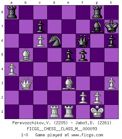 Last move : 1-0 2021 May 24 22:52:19 [Event "FICGS__CHESS__CLASS_M__000093"] [Site "FICGS"] [Date "2021.01.03"] [Round "1"] [White "Perevozchikov,Vjacheslav"] [Black "Jabot,Daniel"] [Result "1-0"] [WhiteElo "2205"] [BlackElo "2261"] 1.d4 Nf6 2.c4 e6 3.Nf3 g6 4.Nc3 Bg7 5.e4 d6 6.h3 Nc6 7.Bg5 h6 8.Be3 a6 9.Qc2 O-O 10.Be2 Nd7 11.Rd1 Qe8 12.Qd2 Kh7 13.O-O Rb8 14.b3 b6 15.Rfe1 Qd8 16.d5 Ne7 17.Nd4 e5 18.Nc6 Nxc6 19.dxc6 Nf6 20.b4 Be6 21.a4 Ne8 22.c5 bxc5 23.bxc5 f5 24.exf5 gxf5 25.cxd6 Nxd6 26.Nd5 Bxd5 27.Qxd5 Qf6 28.Bxa6 Ra8 29.Bb5 Rg8 30.Qb3 1-0 Queen's pawn game Kingside Castling by player Black (move 9) Kingside Castling by player White (move 13) Player White won this chess game. Follow this game move after move (download)Chess is as much a mystery as women. (Purdy) Der 70jährige Viktor Kortschnoi: Die Rentenanstalt wollte mich zwingen in Rente zu gehen. Meine Frau erhält jetzt eine Pension- und ich zahle weiter in die Rentenkasse ein! (Viktor Kortschnoi) No es suficiente ser un buen jugador, se debe también de jugar bién. (Siegbert Tarrasch) Pour moi, les échecs ne sont pas un jeu mais un art. (Alexandre Alekhine) Wikichess, chess moves explained by 'experimented' players. (Thibault de Vassal)