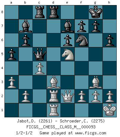 Last move : 1/2-1/2 2021 April 14 22:22:56 [Event "FICGS__CHESS__CLASS_M__000093"] [Site "FICGS"] [Date "2021.01.03"] [Round "1"] [White "Jabot,Daniel"] [Black "Schroeder,Christoph"] [Result "1/2-1/2"] [WhiteElo "2261"] [BlackElo "2275"] 1.e4 e6 2.d4 d5 3.Nc3 dxe4 4.Nxe4 Nd7 5.Nf3 Ngf6 6.Nxf6+ Nxf6 7.Bd3 c5 8.Be3 Qc7 9.Qe2 a6 10.O-O b6 11.Rad1 Bb7 12.Rfe1 Be7 13.Ne5 O-O 14.Bf4 Rfd8 15.dxc5 Bxc5 16.Bg3 Bd6 17.a3 h6 18.c4 a5 19.Rd2 Rac8 20.Red1 Qc5 21.Kh1 Be7 1/2-1/2 French : Rubinstein variation Kingside Castling by player White (move 10) Kingside Castling by player Black (move 13) This chess game ended in a draw. Follow this game move after move (download)Chess is ruthless: you've got to be prepared to kill people. (Nigel Short) Wir irren allesamt, nur jeder irrt anders. (Georg Christoph Lichtenberg) Tu eres para mi la Reina en d8 y yo soy el Peón en d7!!. (GM Eduard Gufeld) On n'a jamais que l'âge auquel on a commence à jouer aux échecs car après on cesse de vieillir. (Capablanca) Looking at the proliferation of personal web pages on the Net, it looks like very soon everyone on Earth will have 15 megabytes of fame. (M.G. Sriram)