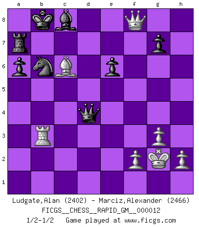 Last move : 1/2-1/2 2021 January 24 15:56:50 [Event "FICGS__CHESS__RAPID_GM__000012"] [Site "FICGS"] [Date "2021.01.06"] [Round "1"] [White "Ludgate,Alan"] [Black "Marciz,Alexander"] [Result "1/2-1/2"] [WhiteElo "2402"] [BlackElo "2466"] 1.d4 d5 2.Nf3 Nf6 3.c4 e6 4.Nc3 c6 5.g3 dxc4 6.Bg2 Nbd7 7.O-O b5 8.e4 Bb7 9.e5 Nd5 10.Ng5 h6 11.Nxe6 fxe6 12.Qh5+ Ke7 13.Ne4 Qe8 14.Bg5+ hxg5 15.Qxh8 Kd8 16.Nxg5 Kc8 17.a4 Nc7 18.Ne4 Kb8 19.Qh7 Qd8 20.Nd6 Nb6 21.Qg8 a6 22.axb5 Nxb5 23.Rfe1 Nxd6 24.exd6 Bc8 25.b3 cxb3 26.Bxc6 Ra7 27.Reb1 Qxd6 28.Rxb3 Qxd4 29.Qxf8 Qxa1+ 30.Kg2 Qd4 1/2-1/2 Queen's pawn game Kingside Castling by player White (move 7) This chess game ended in a draw. Follow this game move after move (download)Capture of the adverse King is the ultimate but not the first object of the game. (William Steinitz) Moralische Siege zählen nicht. (Savielly Grigorievitsch Tartakower) El ganador de una partida es aquel jugador que hace el penúltimo error. (Savielly Tartakover) Les ravages du H expliquent la différence de niveau entre Tal et Thal [Abergel]. All art requires courage. (Anne Tucker)