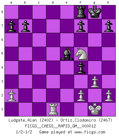Last move : 1/2-1/2 2021 January 11 15:13:15 [Event "FICGS__CHESS__RAPID_GM__000012"] [Site "FICGS"] [Date "2021.01.06"] [Round "1"] [White "Ludgate,Alan"] [Black "Ortiz,Clodomiro"] [Result "1/2-1/2"] [WhiteElo "2402"] [BlackElo "2467"] 1.d4 Nf6 2.c4 e6 3.Nc3 Bb4 4.Qc2 O-O 5.e4 d5 6.e5 Ne4 7.Bd3 c5 8.Nge2 cxd4 9.Nxd4 Nd7 10.Bf4 Qh4 11.g3 Qh5 12.O-O g5 13.cxd5 gxf4 14.dxe6 Nxc3 15.exd7 Bxd7 16.bxc3 Rac8 17.Qd1 Qxd1 18.Raxd1 Bxc3 19.Bf5 Rcd8 20.Bxd7 Rxd7 21.Nf5 Rxd1 22.Rxd1 Bxe5 1/2-1/2 Nimzo-Indian : Classical variation Kingside Castling by player Black (move 4) Kingside Castling by player White (move 12) This chess game ended in a draw. Follow this game move after move (download)I'm not afraid of Spassky. The world knows I'm the best. You don't need a match to prove it. (Bobby Fischer) Ohne Fehler kann es keine Brillanz geben. (Emanuel Lasker) Las leyes del Ajedrez no permiten una libre elección: tienes que mover quieras o no. (Emanuel Lasker) Les réformistes prétendent que les progrès de la théorie conduiront à la disparition des échecs, et qu'il faut, pour leur rendre vie, en remanier les règles. En réalité, qu'exprime cette affirmation? Le mépris de l'intuition, de l'imagination et de tous les autres éléments qui font des échecs un art. (Alexander Alekhine) Heh, heh, heh. Time to abandon ship. (General Grievous in Star Wars ep.3)