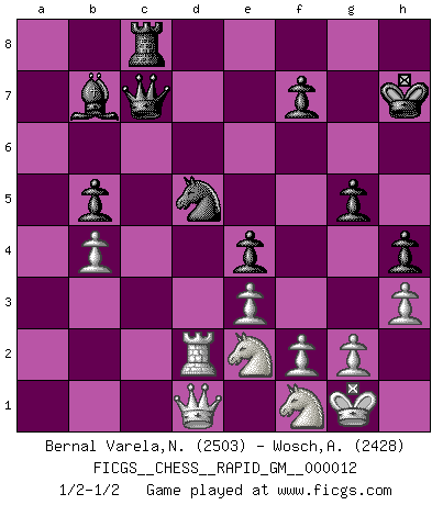 Last move : 1/2-1/2 2021 May 20 7:28:6 [Event "FICGS__CHESS__RAPID_GM__000012"] [Site "FICGS"] [Date "2021.01.06"] [Round "1"] [White "Bernal Varela,Nelson"] [Black "Wosch,Arkadiusz"] [Result "1/2-1/2"] [WhiteElo "2503"] [BlackElo "2428"] 1.Nf3 Nf6 2.d4 d5 3.c4 e6 4.e3 Nbd7 5.b3 b6 6.cxd5 exd5 7.Ba3 Bxa3 8.Nxa3 O-O 9.Rc1 Bb7 10.Bd3 a6 11.Nb1 c5 12.O-O Qe7 13.Nc3 Rac8 14.Ne2 Rc7 15.Nf4 Ra8 16.Rc2 h6 17.Qa1 a5 18.h3 a4 19.Qb2 axb3 20.axb3 Ne4 21.Rd1 Nd6 22.Qc1 Ne4 23.Bxe4 dxe4 24.Nd2 Nf6 25.Nc4 cxd4 26.Rxd4 Rc6 27.Qb1 b5 28.Nd2 Rxc2 29.Qxc2 Rc8 30.Qb2 Qc5 31.Nf1 Kh7 32.Qe2 h5 33.b4 Qe5 34.Qa2 Qc7 35.Ng3 g6 36.Rd1 h4 37.Nf1 g5 38.Ne2 Qc4 39.Qa1 Nd5 40.Rd2 Qc7 41.Qd1 1/2-1/2 Reti Opening Kingside Castling by player Black (move 8) Kingside Castling by player White (move 12) This chess game ended in a draw. Follow this game move after move (download)Everything is in a state of flux, and this includes the world of Chess. (Mikhail Botvinnik) Rauchen ist dem Schachspieler bei seiner Arbeit, also im Wettkampf, untersagt. (Viktor Kortschnoi) No todos los artistas son jugadores de Ajedrez, pero todos los jugadores de Ajedrez son artistas. (Marcel Duchamp) Seul un grand joueur sait à quel point il joue faiblement. (Xavier Tartacover) Life doesn't imitate art, it imitates bad television. (Woody Allen)