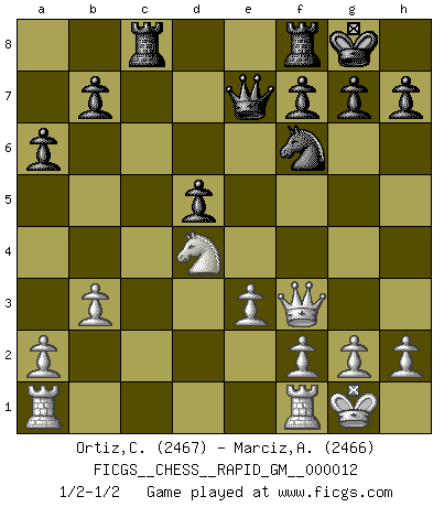 Last move : 1/2-1/2 2021 January 22 12:1:33 [Event "FICGS__CHESS__RAPID_GM__000012"] [Site "FICGS"] [Date "2021.01.06"] [Round "1"] [White "Ortiz,Clodomiro"] [Black "Marciz,Alexander"] [Result "1/2-1/2"] [WhiteElo "2467"] [BlackElo "2466"] 1.d4 Nf6 2.c4 e6 3.Nf3 d5 4.Nc3 c6 5.e3 Nbd7 6.Qc2 Bd6 7.b3 O-O 8.Be2 e5 9.cxd5 cxd5 10.Nb5 Bb4+ 11.Bd2 Bxd2+ 12.Nxd2 a6 13.dxe5 Nxe5 14.Nd4 Bg4 15.Bxg4 Nfxg4 16.O-O Rc8 17.Qd1 Nf6 18.N2f3 Nxf3+ 19.Qxf3 Qc7 20.Qd1 Qd7 21.Qf3 Qe7 1/2-1/2 Queen's pawn game Kingside Castling by player Black (move 7) Kingside Castling by player White (move 16) This chess game ended in a draw. Follow this game move after move (download)Of Chess it has been said that life is not long enough for it, but that is the fault of life, not Chess. (William Ewart Napier) Mit Schach schule ich mein Gefühl für Geometrie, was für Tennis und Schach gleichermaßen wichtig ist. (Boris Becker) Los libros de Ajedrez deben de usarse igual como usamos los anteojos: para mejorar la vista, aunque algunos jugadores los quieren usar como si ellos les otorgaran la vision. (José Raúl Capablanca) Votre prénom est 'Tactique', votre deuxième prénom est 'Tactique' et votre nom est 'Tactique'. (Ken Smith) Internet: Absolute communication, absolute isolation. (Paul Carvel)