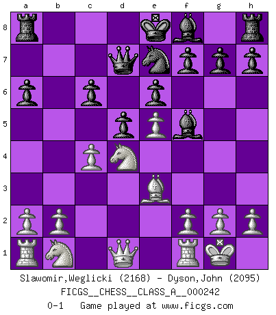 Last move : 0-1 2021 March 22 12:34:25 [Event "FICGS__CHESS__CLASS_A__000242"] [Site "FICGS"] [Date "2021.01.09"] [Round "1"] [White "Slawomir,Weglicki"] [Black "Dyson,John"] [Result "0-1"] [WhiteElo "2168"] [BlackElo "2095"] 1.e4 c6 2.d4 d5 3.e5 Bf5 4.Nf3 e6 5.Be2 c5 6.Be3 cxd4 7.Nxd4 Ne7 8.O-O Nbc6 9.Bb5 a6 10.Bxc6+ bxc6 11.c4 Qd7 0-1 Caro-Kann : Advance variation Kingside Castling by player White (move 8) Player Black won this chess game. Follow this game move after move (download)Fischer, who may or may not be mad as a hatter, has every right to be horrified. (Jeremy Silman) Ich liebe den Moment, wenn ich das Ego meines Gegenüber breche. (Robert James Fischer) En el tablero, la mentira e hipocresía no sobreviven mucho. (Emanuel Lasker) On entre au jeu d'Echecs comme on entre en Religion. Pour le joueur d'Echecs, la partie d'Echecs c'est l'office, la messe, le défilé du 1er Mai, le dépôt de gerbe au Monument aux Morts. C'est un drame sacré. (Michel Roos) Memory is a complicated thing, a relative to truth, but not its twin. (Barbara Kingsolver, Animal Dreams)