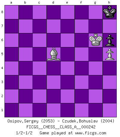 Last move : 1/2-1/2 2021 April 1 20:29:1 [Event "FICGS__CHESS__CLASS_A__000242"] [Site "FICGS"] [Date "2021.01.09"] [Round "1"] [White "Osipov,Sergey"] [Black "Czudek,Bohuslav"] [Result "1/2-1/2"] [WhiteElo "2053"] [BlackElo "2004"] 1.d4 Nf6 2.c4 g6 3.Nc3 Bg7 4.e4 d6 5.f3 O-O 6.Be3 Nc6 7.Nge2 a6 8.Qd2 Rb8 9.Rc1 Bd7 10.Nd1 b5 11.c5 Ne8 12.g3 dxc5 13.Rxc5 e5 14.d5 Ne7 15.Nf2 Nd6 16.b3 Nb7 17.Rc1 c6 18.dxc6 Nxc6 19.Bg2 Rc8 20.f4 Qa5 21.Nd3 Qxd2+ 22.Kxd2 Rfe8 23.Nc3 f5 24.Rhe1 Nd6 25.Bc5 Nxe4+ 26.Nxe4 fxe4 27.Bxe4 exf4 28.gxf4 Bf6 29.Bd5+ Kg7 30.Rxe8 Rxe8 31.Bd6 Ne7 32.Be4 Rc8 33.Rc5 Rxc5 34.Nxc5 Bc8 35.Ba8 Nf5 36.Be5 Nh6 37.Bxf6+ Kxf6 38.Ne4+ Ke7 39.Kd3 Bf5 40.Kd4 Bxe4 41.Bxe4 b4 42.Kc5 a5 43.Kb5 Kd6 44.h4 Ng8 45.f5 gxf5 46.Bxf5 h6 47.Be4 Nf6 48.Bf3 Nd7 49.Kxa5 Kc5 50.h5 Ne5 51.Be2 Nc6+ 52.Ka4 Nd4 53.Bd3 Nc6 54.Be4 Nd4 55.Bd3 Nc6 56.a3 bxa3 57.Kxa3 Nb4 58.Bc4 Nc2+ 59.Ka4 Nd4 60.Bf7 Nxb3 61.Kxb3 Kd6 62.Kc4 Ke7 63.Bd5 Kf8 64.Kd4 Kg7 65.Ke5 Kh8 66.Ke6 Kg7 67.Be4 Kh8 68.Kf6 Kg8 69.Kg6 Kh8 70.Bd5 1/2-1/2 King's Indian : Saemisch, Panno formation Kingside Castling by player Black (move 5) 10 pieces endgame at move 46 : White KBPPP , Black KNPPP WHITE : King + 1 Bishop 3 Pawns BLACK : King + 1 Knight 3 Pawns 9 pieces endgame at move 49 : White KBPPP , Black KNPP WHITE : King + 1 Bishop 3 Pawns BLACK : King + 1 Knight 2 Pawns 8 pieces endgame at move 56 : White KBPP , Black KNPP WHITE : King + 1 Bishop 2 Pawns BLACK : King + 1 Knight 2 Pawns 7 pieces endgame at move 57 : White KBPP , Black KNP WHITE : King + 1 Bishop 2 Pawns BLACK : King + 1 Knight 1 Pawn 6 pieces endgame at move 60 : White KBP , Black KNP WHITE : King + 1 Bishop 1 Pawn BLACK : King + 1 Knight 1 Pawn 5 pieces endgame at move 61 : White KBP , Black KP WHITE : King + 1 Bishop 1 Pawn BLACK : King + 1 Pawn This chess game ended in a draw. Follow this game move after move (download)If I win a tournament, I win it by myself. I do the playing. Nobody helps me. (Bobby Fischer) Wie ich sie so einen nach dem anderen nieder mähte wurde meine Überlegenheit offensichtlich. (José Raúl Capablanca) Me dio la sensación de como si yo estuviera jugando en contra del mismo Ajedrez. - al estar jugando en contra de Robert Fischer (Walter Shipman) À la honte des hommes, on sait que les lois du jeu sont les seules qui soient partout justes, claires, inviolables et exécutées. Pourquoi l'Indien qui a donné les règles du jeu d'échecs est-il obéi de bon gré dans toute la terre, et que les décrétales des papes, par exemple, sont aujourd'hui un objet d'horreur et de mépris ? C'est que l'inventeur des échecs combina tout avec justesse pour la satisfaction des joueurs, et que les papes, dans leurs décrétales, n'eurent en vue que leur seul avantage. L'Indien voulut exercer également l'esprit des hommes et leur donner du plaisir; les papes ont voulu abrutir l'esprit des hommes. Voltaire (Dictionnaire philosophique / Garnier 1967) Somehow our devils are never quite what we expect when we meet them face to face. (Nelson DeMille)
