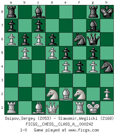 Last move : 1-0 2021 March 20 7:43:3 [Event "FICGS__CHESS__CLASS_A__000242"] [Site "FICGS"] [Date "2021.01.09"] [Round "1"] [White "Osipov,Sergey"] [Black "Slawomir,Weglicki"] [Result "1-0"] [WhiteElo "2053"] [BlackElo "2168"] 1.d4 Nf6 2.Nf3 g6 3.c4 Bg7 4.Nc3 O-O 5.e4 d6 6.Be2 e5 7.O-O Nc6 8.d5 Ne7 9.Ne1 Nd7 10.Nd3 f5 11.f3 f4 12.b4 Nf6 13.a4 h5 14.a5 Kh8 15.c5 g5 16.b5 Ng6 17.c6 Rg8 18.Nf2 Qe8 19.g4 hxg4 20.fxg4 Nh4 21.a6 b6 22.Nb1 Qg6 23.Nd2 1-0 King's Indian : East Indian defense Kingside Castling by player Black (move 4) Kingside Castling by player White (move 7) Player White won this chess game. Follow this game move after move (download)White lost because he failed to remember the right continuation and had to think up the moves himself. (Siegbert Tarrasch) Ein Buch ist ein Spiegel; wenn ein Affe hineinsieht, so kann kein Apostel heraus gucken. (Georg Christoph Lichtenberg) Hay jugadores fuertes y personas amables y yo soy un jugador fuerte. (Bobby Fischer) Votre prénom est 'Tactique', votre deuxième prénom est 'Tactique' et votre nom est 'Tactique'. (Ken Smith) To send light into the darkness of men's hearts - such is the duty of the artist. (Schumann)