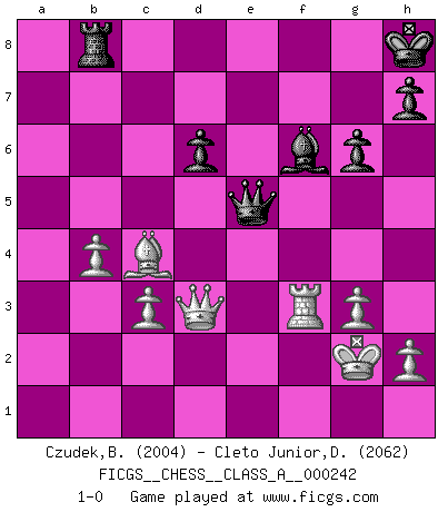Last move : 1-0 2021 March 8 11:0:0 [Event "FICGS__CHESS__CLASS_A__000242"] [Site "FICGS"] [Date "2021.01.09"] [Round "1"] [White "Czudek,Bohuslav"] [Black "Cleto Junior,Dirceu"] [Result "1-0"] [WhiteElo "2004"] [BlackElo "2062"] 1.e4 c5 2.Nf3 e6 3.d4 cxd4 4.Nxd4 Nf6 5.Nc3 Nc6 6.Ndb5 d6 7.Bf4 e5 8.Bg5 a6 9.Na3 b5 10.Nd5 Be7 11.Bxf6 Bxf6 12.c3 O-O 13.Nc2 Bg5 14.a4 bxa4 15.Rxa4 a5 16.Bc4 Rb8 17.b3 Kh8 18.Nce3 Ne7 19.O-O f5 20.Nxe7 Qxe7 21.Nxf5 Bxf5 22.exf5 Rxf5 23.Rxa5 g6 24.Rd5 e4 25.g3 Rxd5 26.Qxd5 e3 27.Kg2 Qe5 28.fxe3 Bxe3 29.Qd3 Bg5 30.b4 Bf6 31.Rf3 1-0 Sicilian : Anderssen variation Kingside Castling by player Black (move 12) Kingside Castling by player White (move 19) Player White won this chess game. Follow this game move after move (download)Help your pieces so they can help you. (Paul Morphy) Das Schach hält seine Meister in eigenen Banden, Fesseln; auf vielerlei Weise formt es ihren Geist, so dass die innere Freiheit selbst des Stärksten beeinflusst wird. (Albert Einstein) En el Ajedrez, tal como en la vida, las bendiciones de hoy pueden ser el veneno del mañana. (Assaic) Si le désir cupide (et stupide) de gagner est une inépuisable source de souffrance, une combinaison brillante sur l'échiquier est une découverte : le coquelicot qui s'épanouit lorsque apparaît la Voie Lactée. (Arrabal) The faster the computer, the slower the brain. (Thibault de Vassal)