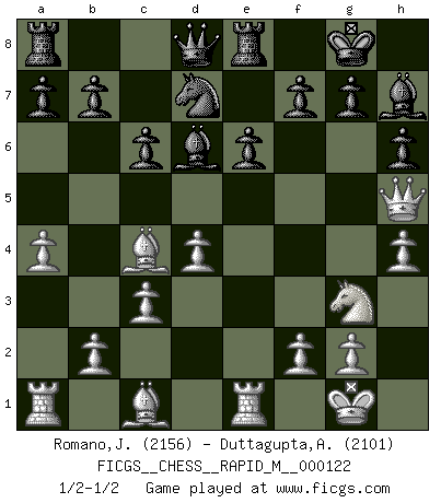 Last move : 1/2-1/2 2021 January 26 19:48:40 [Event "FICGS__CHESS__RAPID_M__000122"] [Site "FICGS"] [Date "2021.01.09"] [Round "1"] [White "Romano,Jacopo"] [Black "Duttagupta,Aniruddha"] [Result "1/2-1/2"] [WhiteElo "2156"] [BlackElo "2101"] 1.e4 c6 2.d4 d5 3.Nc3 dxe4 4.Nxe4 Bf5 5.Ng3 Bg6 6.h4 h6 7.Nh3 Nf6 8.Nf4 Bh7 9.Bc4 e6 10.O-O Bd6 11.Re1 O-O 12.c3 Re8 13.Nfh5 Nxh5 14.Qxh5 Nd7 15.a4 1/2-1/2 Caro-Kann : Classical, 6.h4 Kingside Castling by player White (move 10) Kingside Castling by player Black (move 11) This chess game ended in a draw. Follow this game move after move (download)All Chess players should have a hobby. (Savielly Tartakower) Schach ist Leben. (Robert James Fischer) Debemos de asegurarnos de que el Ajedrez no se convierta en un lenguaje muerto, muy interesante, pero tan solo para un grupo muy pequeño. (Sytze Faber) Mais n'est-ce pas déjà le limiter injurieusement que d'appeler les échecs un jeu? N'est-ce pas aussi une science, un art, ou quelque chose qui, comme le cercueil de Mahomet entre ciel et terre, est suspendu entre l'un et l'autre, et qui réunit un nombre incroyable de contraires ? (Stefan Zweig) I have opinions of my own - strong opinions - but I don't always agree with them. (George Bush)