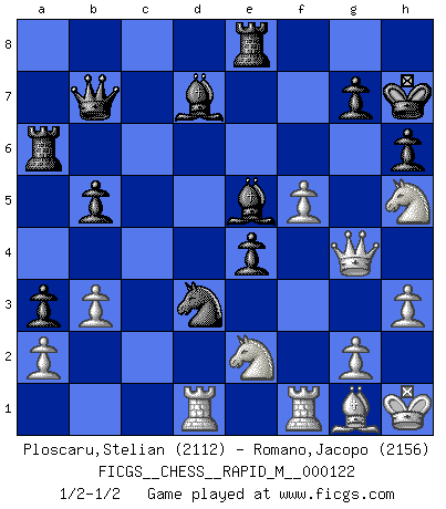 Last move : 1/2-1/2 2021 March 8 18:46:56 [Event "FICGS__CHESS__RAPID_M__000122"] [Site "FICGS"] [Date "2021.01.09"] [Round "1"] [White "Ploscaru,Stelian"] [Black "Romano,Jacopo"] [Result "1/2-1/2"] [WhiteElo "2112"] [BlackElo "2156"] 1.e4 e5 2.Nf3 Nc6 3.Bb5 a6 4.Ba4 Nf6 5.O-O Be7 6.Re1 b5 7.Bb3 d6 8.c3 O-O 9.h3 Na5 10.Bc2 c5 11.d4 Qc7 12.Nbd2 cxd4 13.cxd4 Nc6 14.Nb3 a5 15.Be3 a4 16.Nbd2 Bd7 17.Rc1 Qb7 18.Nf1 Rfe8 19.Ng3 Bd8 20.Qe2 h6 21.dxe5 Nxe5 22.Nd4 d5 23.f4 Nc4 24.e5 Ne4 25.Bxe4 dxe4 26.Red1 a3 27.b3 Nb2 28.Rf1 Ra6 29.Kh1 Nd3 30.Rcd1 Rg6 31.Nh5 Ra6 32.Bg1 f6 33.exf6 Bxf6 34.f5 Kh7 35.Qg4 Be5 36.Ne2 1/2-1/2 Ruy Lopez : Closed Kingside Castling by player White (move 5) Kingside Castling by player Black (move 8) This chess game ended in a draw. Follow this game move after move (download)White lost because he failed to remember the right continuation and had to think up the moves himself. (Siegbert Tarrasch) Habe Mut, dich deines eigenen Verstandes zu bedienen. (Immanuel Kant) Coloca el contenido de las piezas del Ajedrez en un sombrero, agitalo vigorosamente, arrojalas en un tablero desde una altura de 30 centimetros y así obtendras el estilo de Steinitz. (H. E. Bird) Que feriez-vous si vous étiez en train de jouer aux échecs et que la fin du monde arrive ? Je continuerais à jouer. (Saint Borromée) I would love to change the world, but they won't give me the source code. (Unknown)